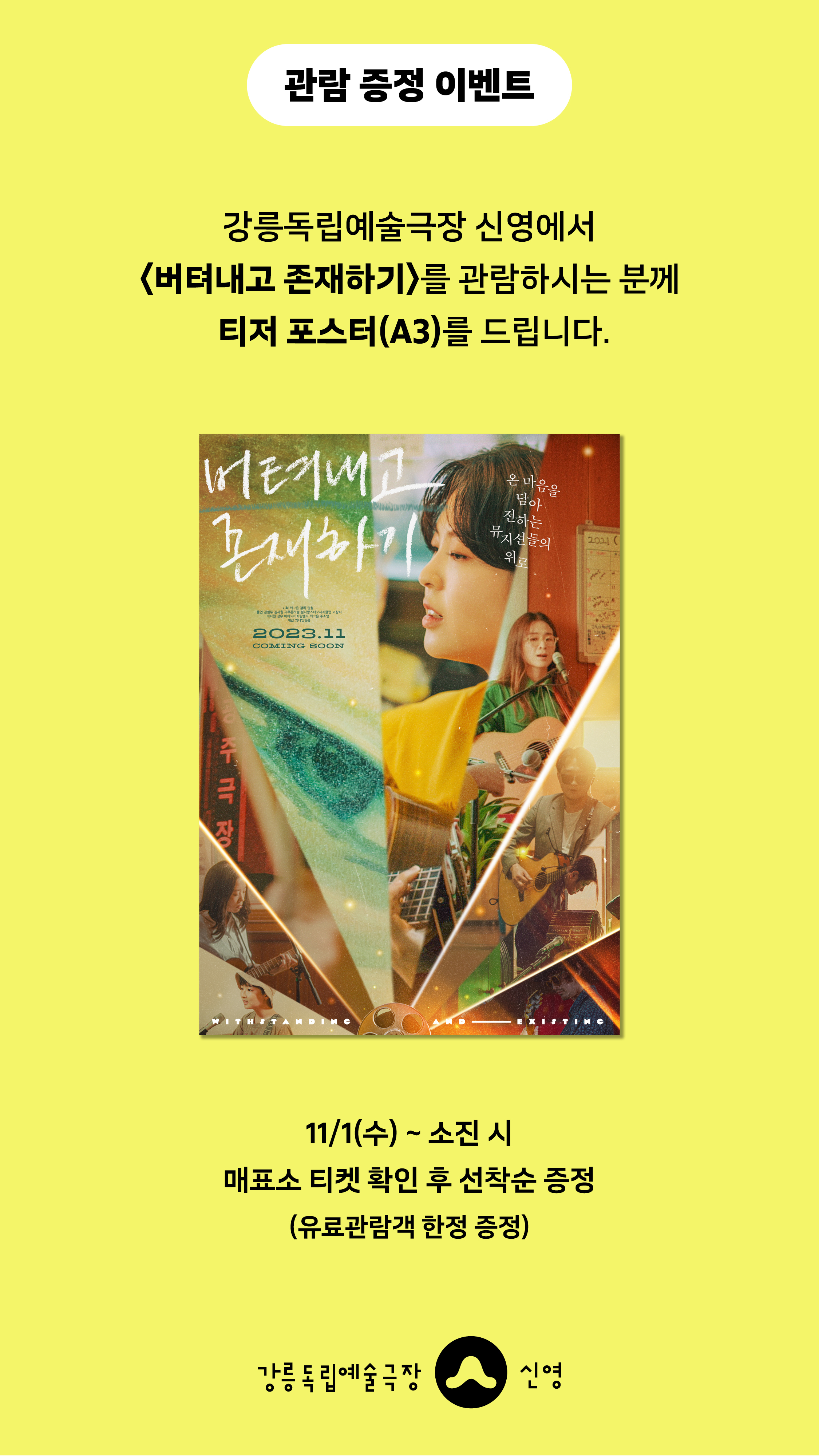 강릉독립예술극장 신영에서 <버텨내고 존재하기>를 관람하시는 분께 선착순으로 티져 포스터(A3)를 드립니다.