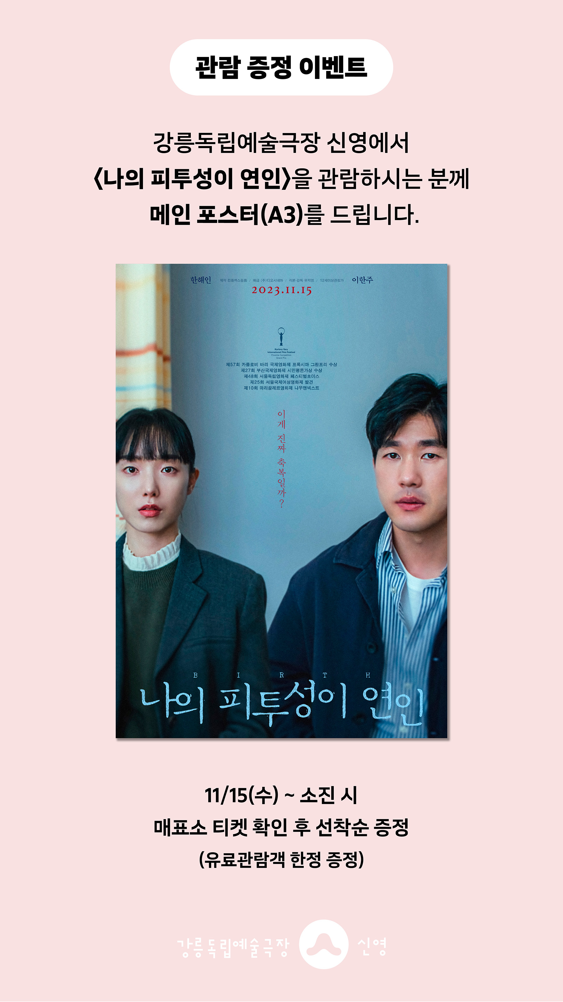 강릉독립예술극장 신영에서 <나의 피투성이 연인>을 관람하시는 분께 선착순으로 <나의 피투성이 연인> 메인포스터(A3)를 드립니다.
