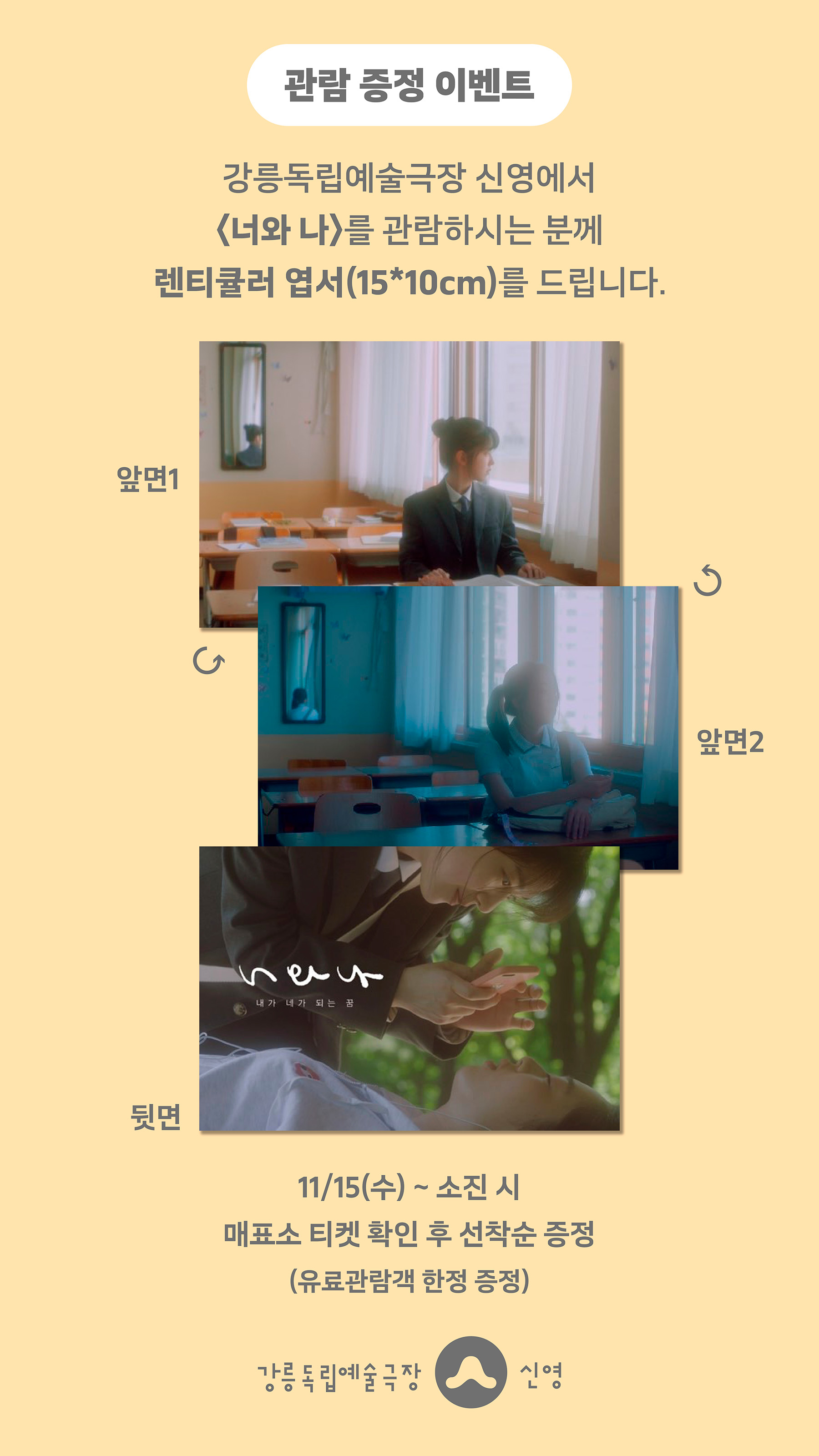 강릉독립예술극장 신영에서 <너와 나>를 관람하시는 분께 선착순으로 <너와 나> 렌티큘러 엽서(15*10)를 드립니다.