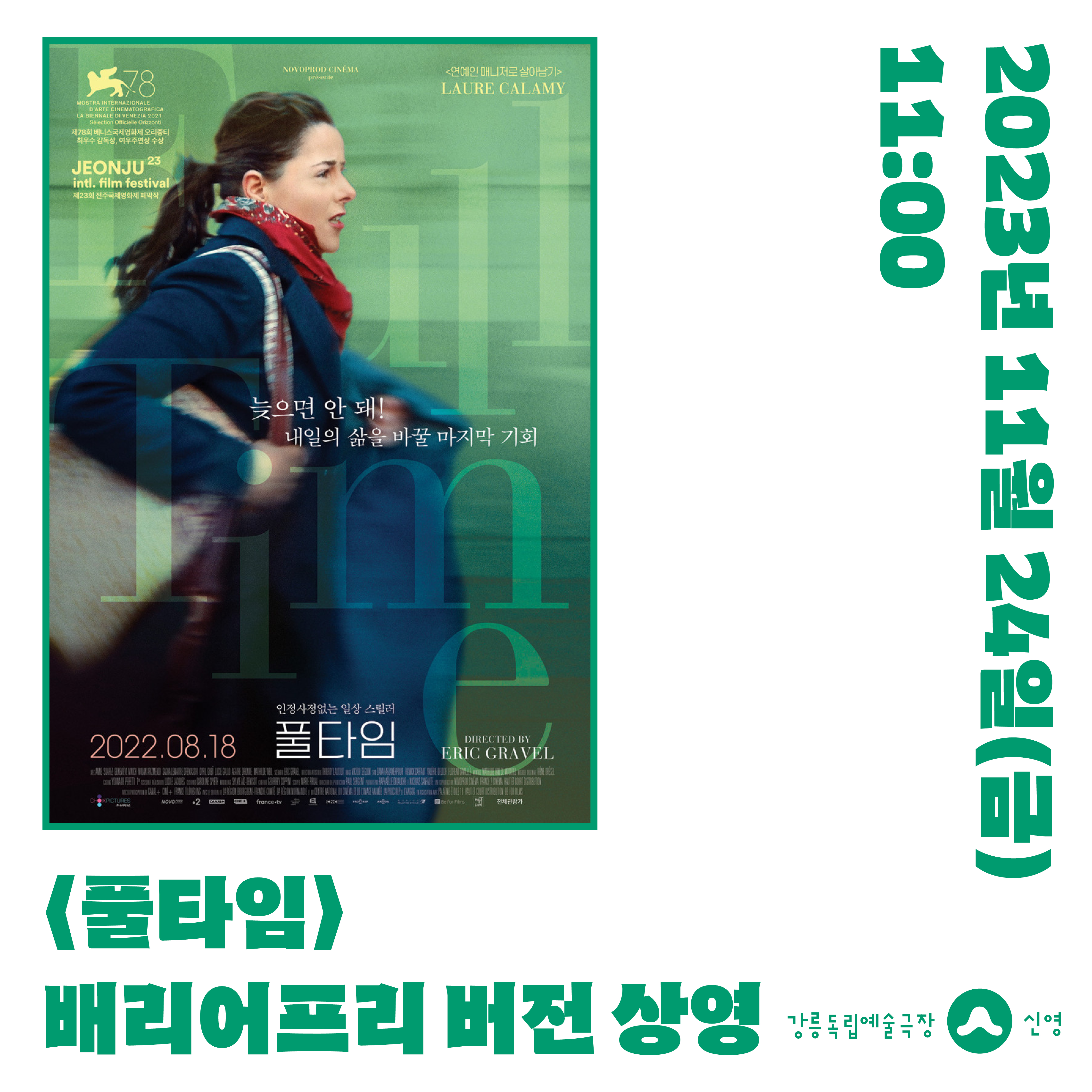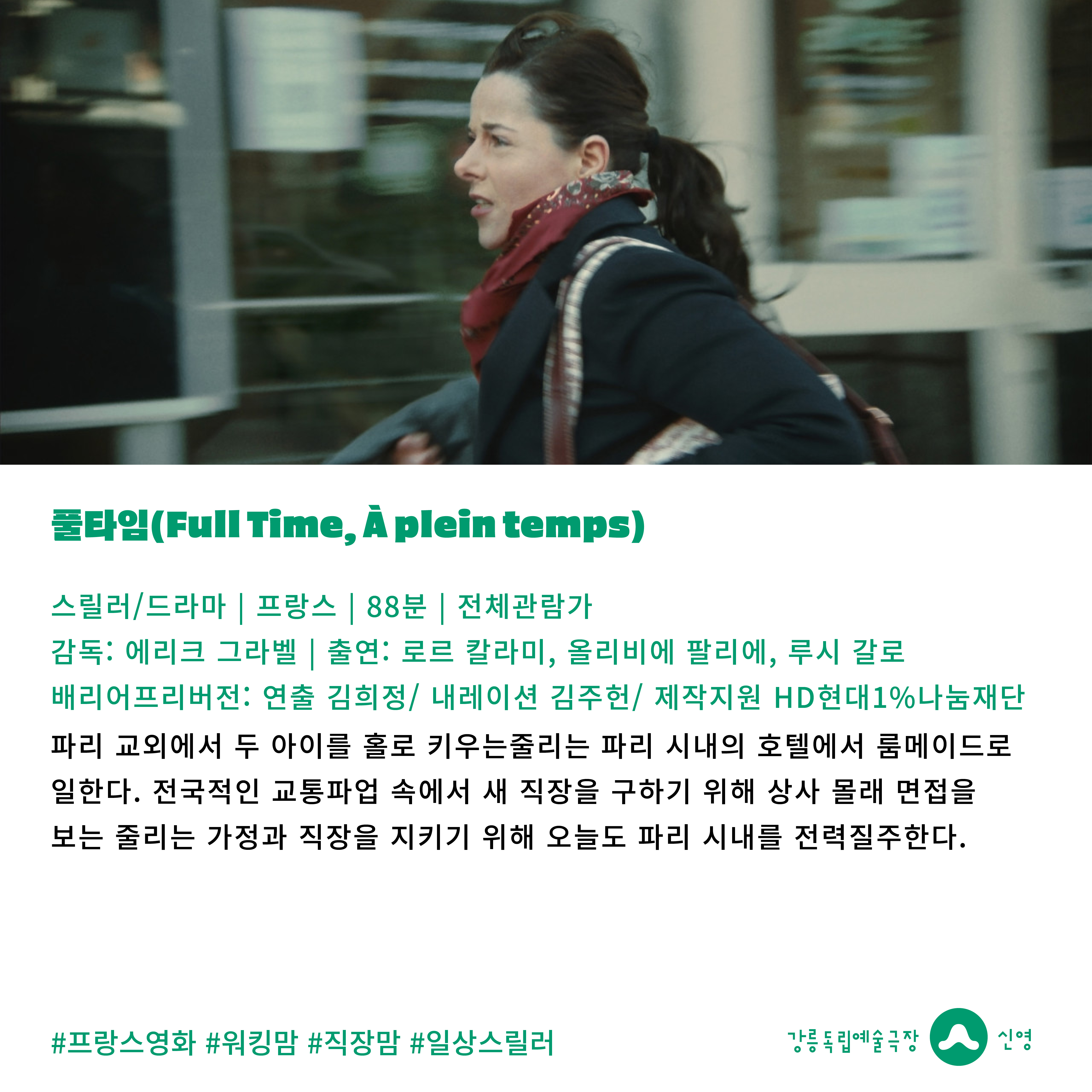 강릉독립예술극장 신영에서는 월 1회 배리어프리 영화를 상영합니다. 11월의 배리어프리 영화는 ⟨풀타임⟩입니다. 프랑스 파리 교외에서 매일 출퇴근 전쟁을 하며, 두 아이를 홀로 키우는 싱글맘 쥘리의 전쟁 같은 고단한 삶을 생생하게 그려낸 영화입니다. 제78회 베니스국제영화제 오리종티 부문 감독상과 여우주연상 2관왕을 석권한 작품 ⟨풀타임⟩을 신영에서 다시 만나보세요.