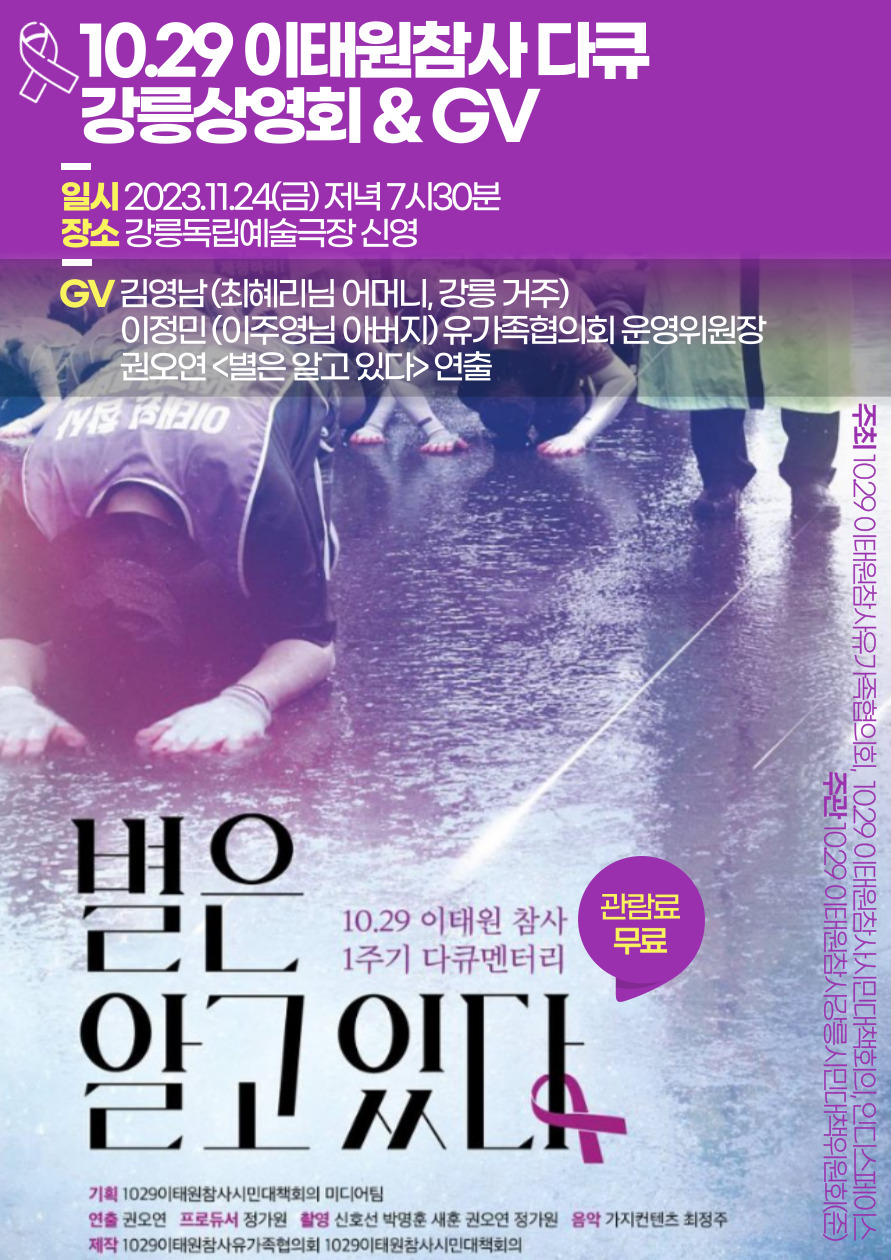 영화 상영에 이어 유가족과 감독이 강릉시민과 대화하는 GV도 진행됩니다. GV에는 연출을 맡은 권오연 감독과 10.29이태원참사유가족협의회 운영위원장 이정민(이주영님 아버지), 그리고 강릉연고 희생자 최혜리님의 어머니 김영남씨가 함께합니다.