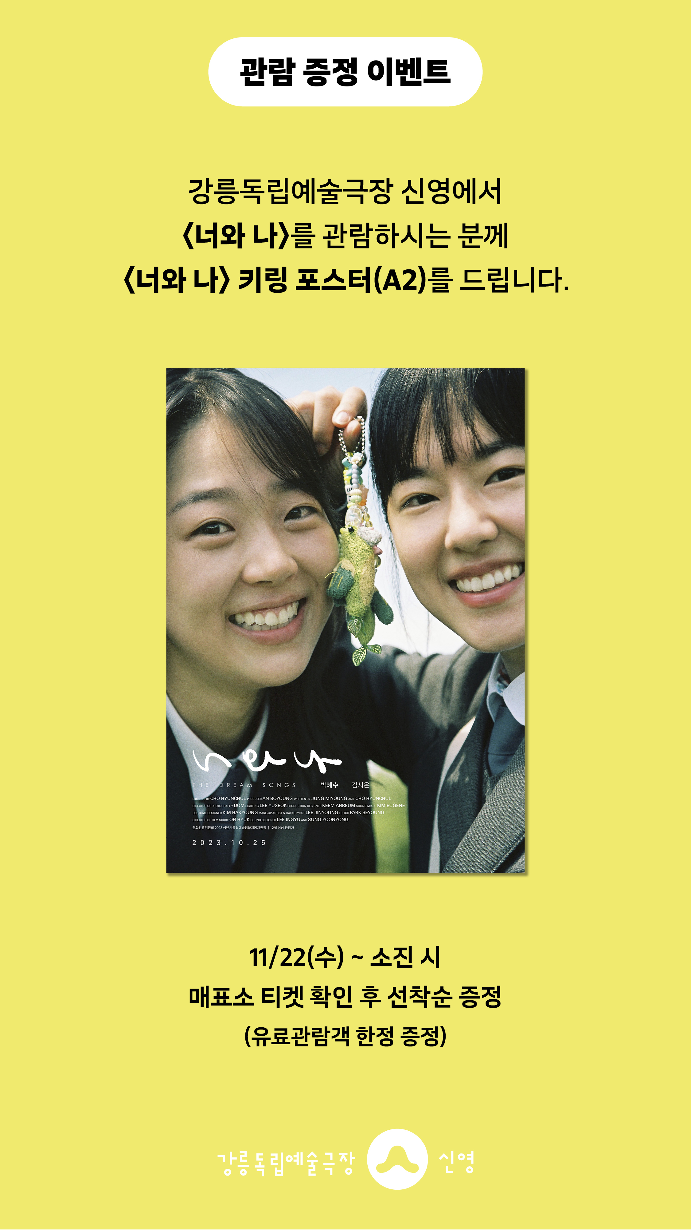 강릉독립예술극장 신영에서 <너와 나>를 관람하시는 분께 선착순으로 <너와 나> 키링 포스터(A3)를 드립니다.