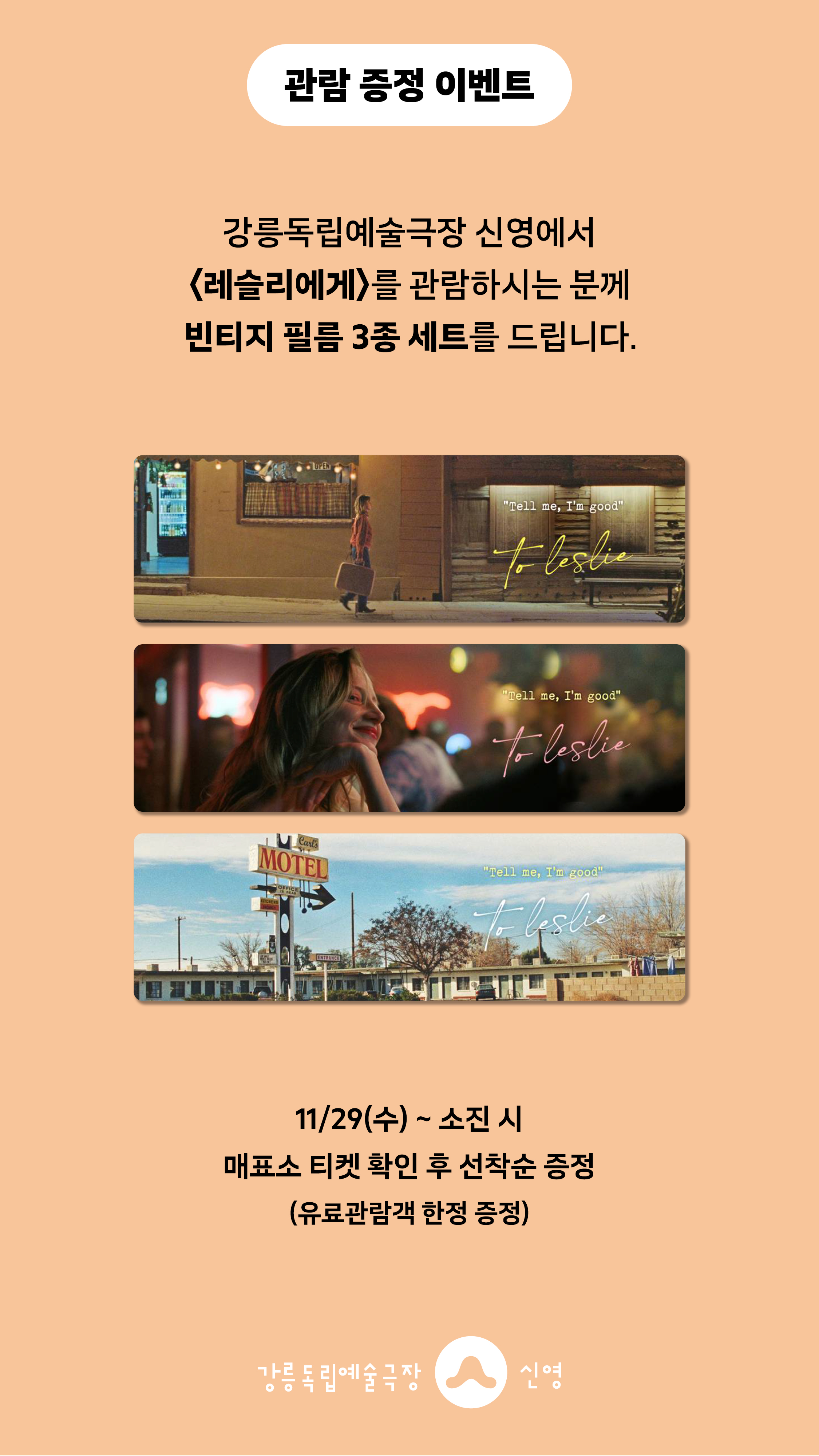 강릉독립예술극장 신영에서 <레슬리에게>를 관람하시는 분께 선착순으로 <레슬리에게> 빈티지 필름 3종 세트를 드립니다.