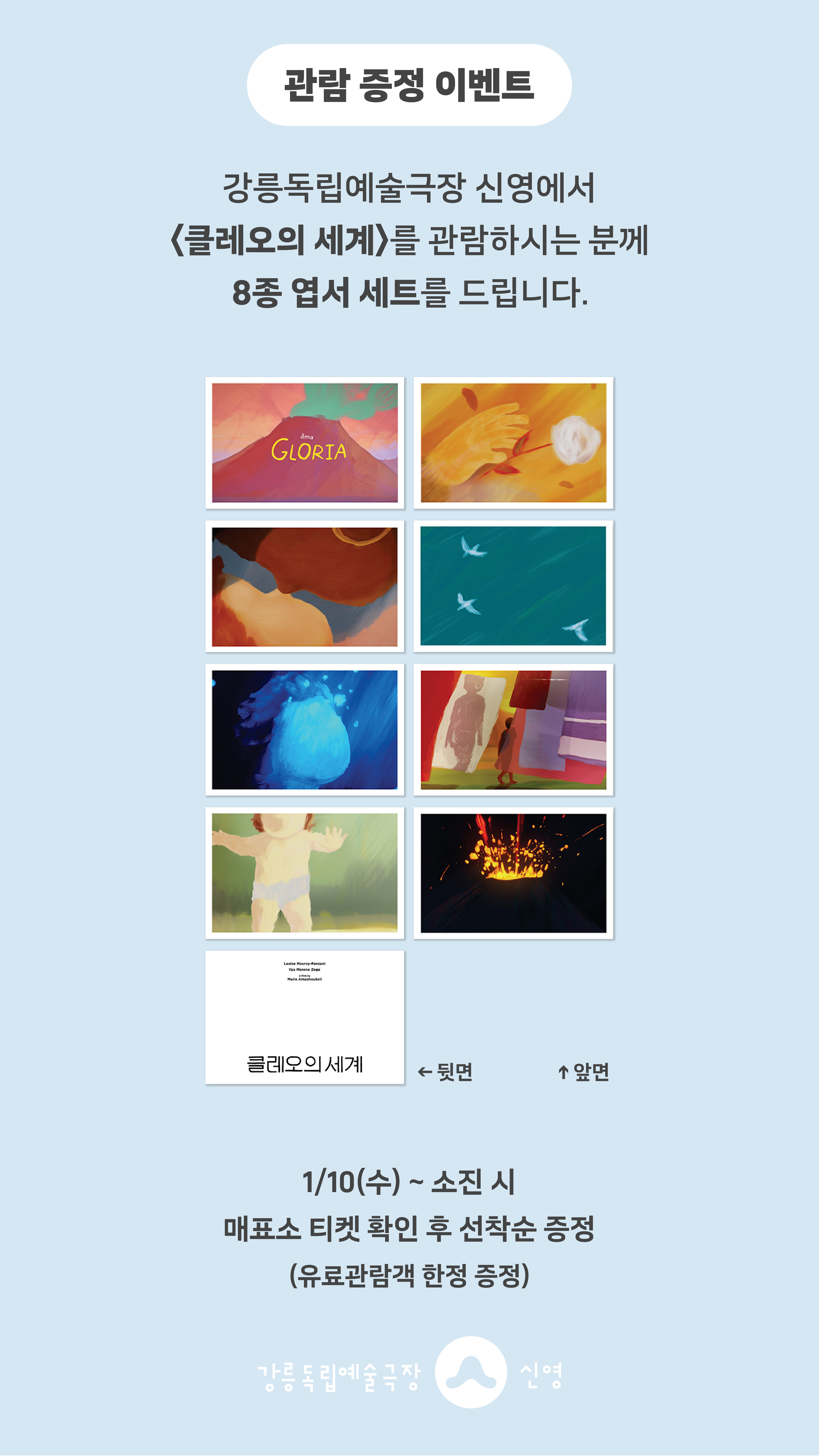 강릉독립예술극장 신영에서 <클레오의 세계>를 관람하시는 분께 선착순으로 <클레오의 세계> 엽서 8종 세트를 드립니다.