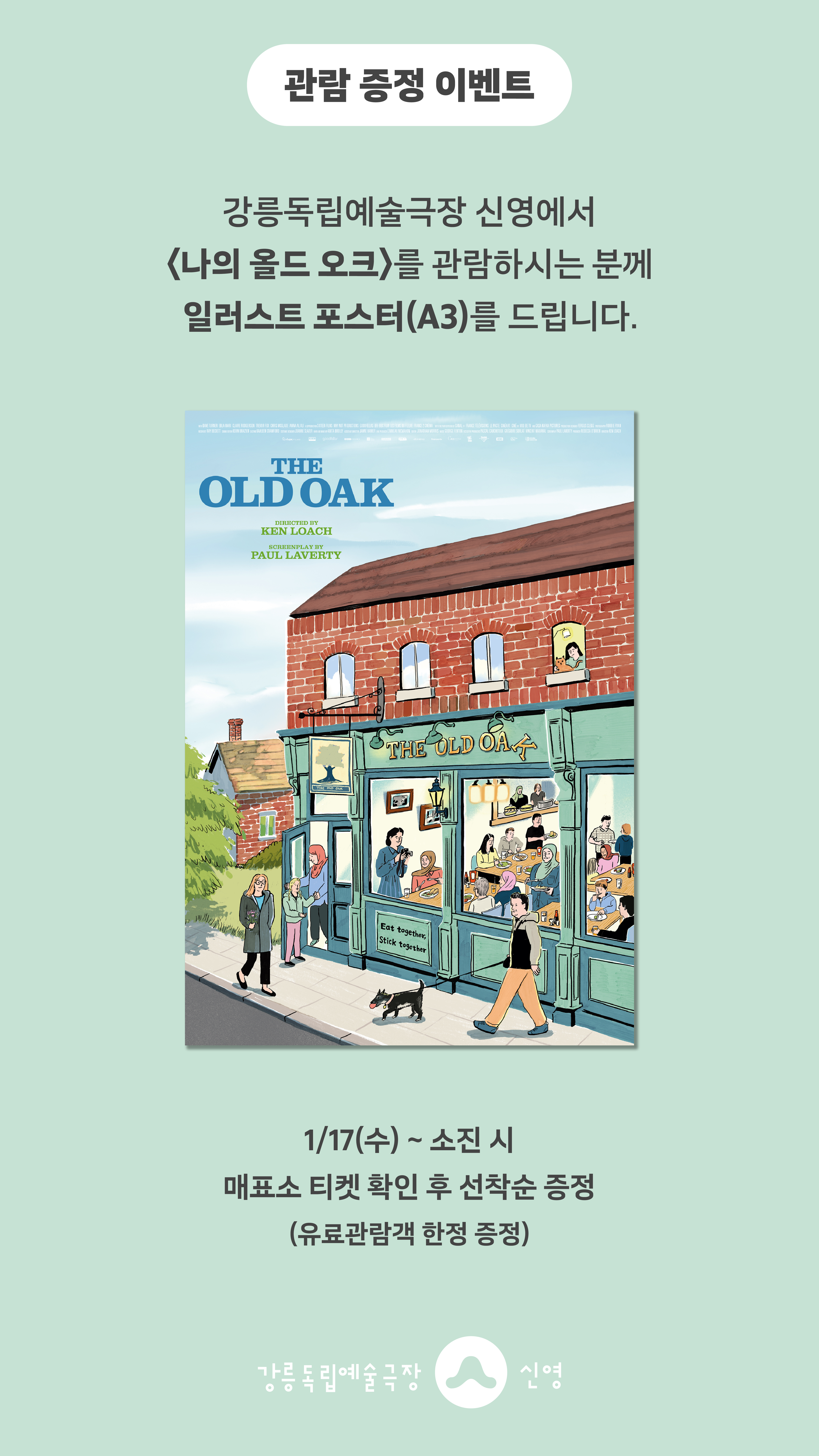 <나, 다니엘 블레이크>, <미안해요, 리키>를 잇는 켄 로치 감독 3부작의 마지막 <나의 올드 오크>강릉독립예술극장 신영에서 <나의 올드 오크>를 관람하시는 분께 선착순으로 <나의 올드 오크> 일러스트 포스터(A3)를 드립니다.✔️ 증정품: <나의 올드 오크> 일러스트 포스터(A3)✔️ 이벤트 기간: 1월 17일(수) ~ 경품 소진 시 이벤트 종료✔️ 증정 방법 : 매표소 티켓 확인 후 선착순 증정