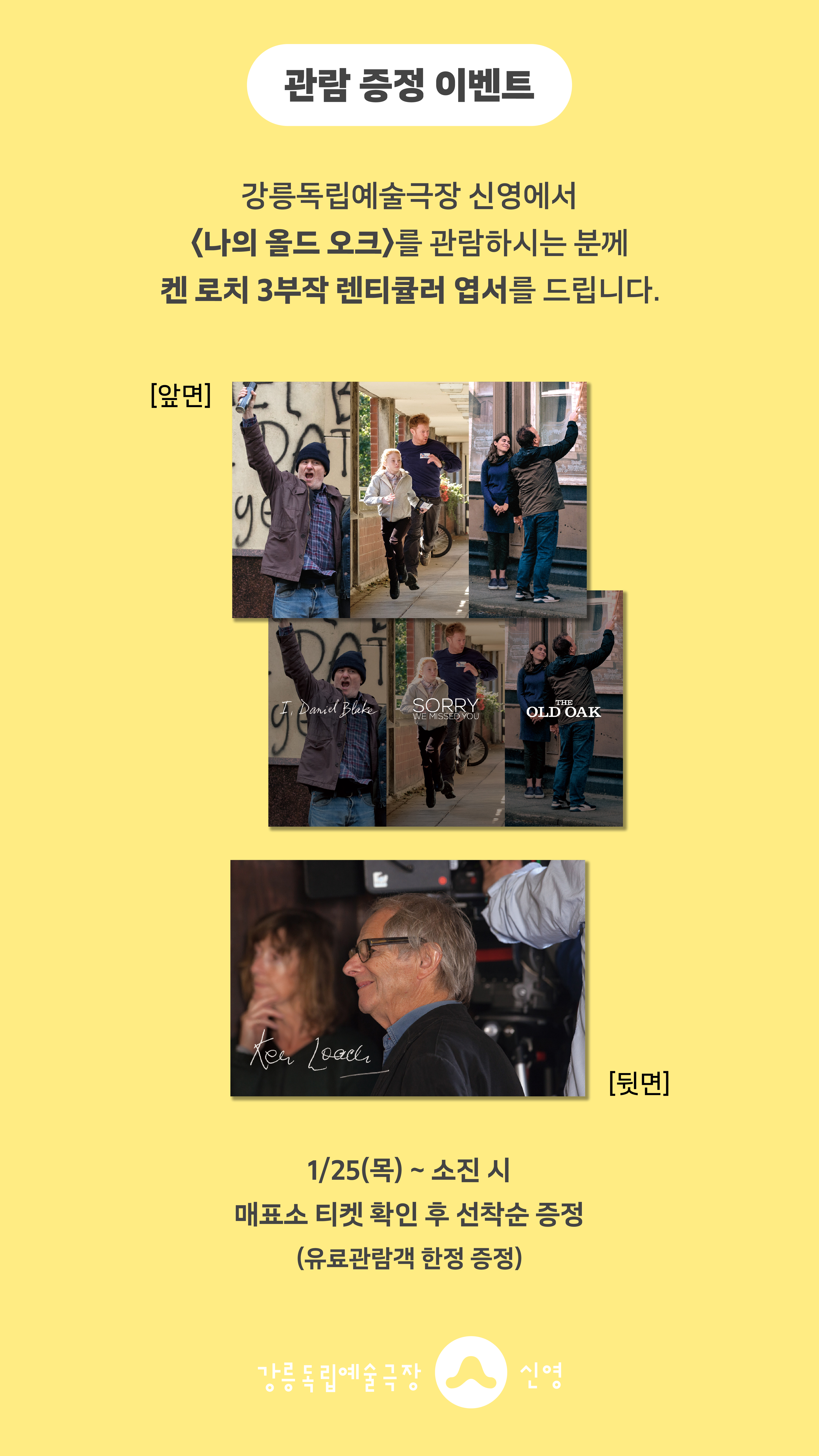 강릉독립예술극장 신영에서 <나의 올드 오크>를 관람하시는 분께 선착순으로 켄 로치 3부작 렌티큘러 엽서를 드립니다.✔️ 증정품: 켄 로치 3부작 렌티큘러 엽서✔️ 이벤트 기간: 1월 25일(목) ~ 경품 소진 시 이벤트 종료✔️ 증정 방법 : 매표소 티켓 확인 후 선착순 증정