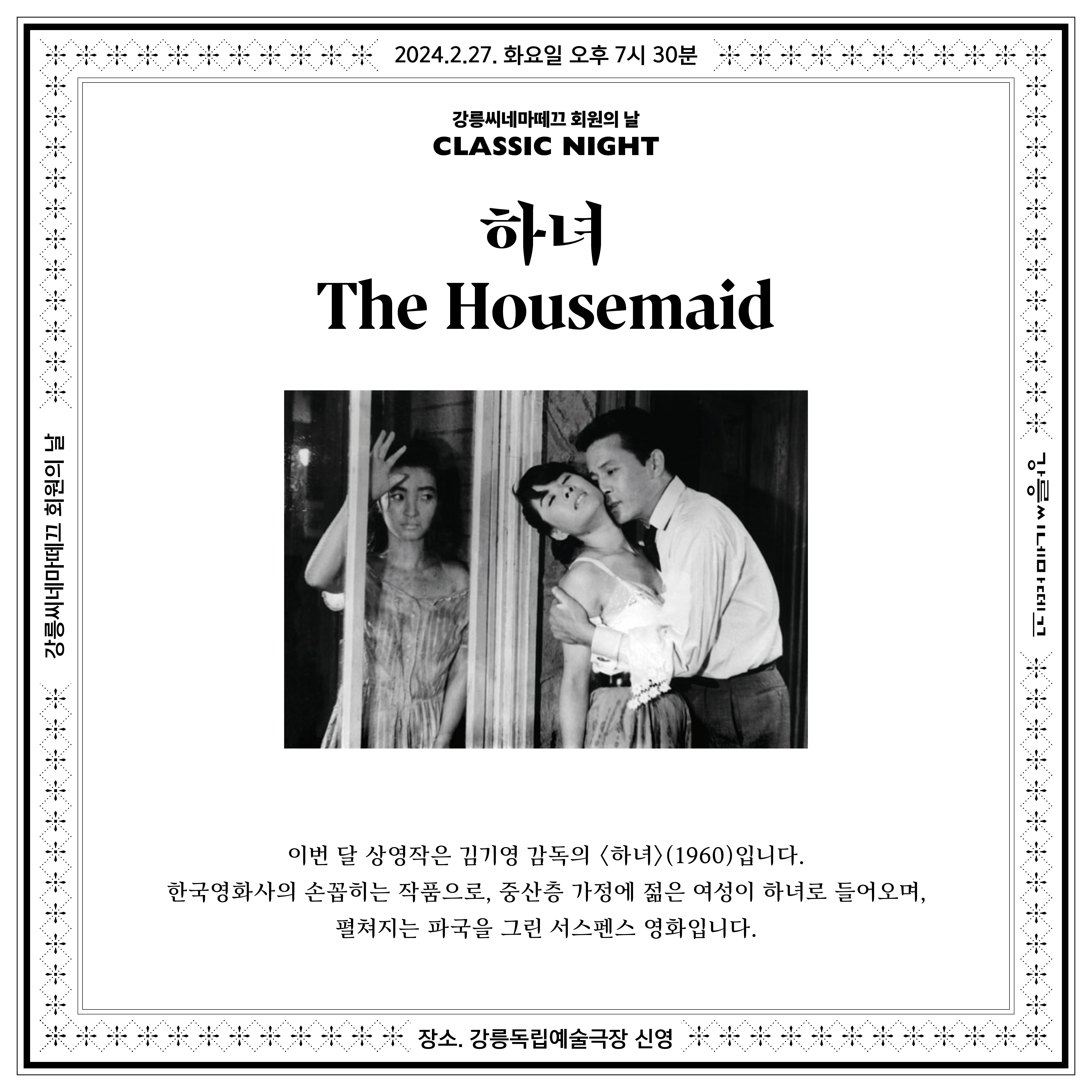 이번 달 상영작은 김기영 감독의 〈하녀〉(1960)입니다. 중산층 가정에 젊은 여성이 하녀로 들어오며, 펼쳐지는 파국을 그린 서스펜스 영화입니다. 한국영화사의 손꼽히는 명작을 극장에서 함께 보고 이야기 나눠요.