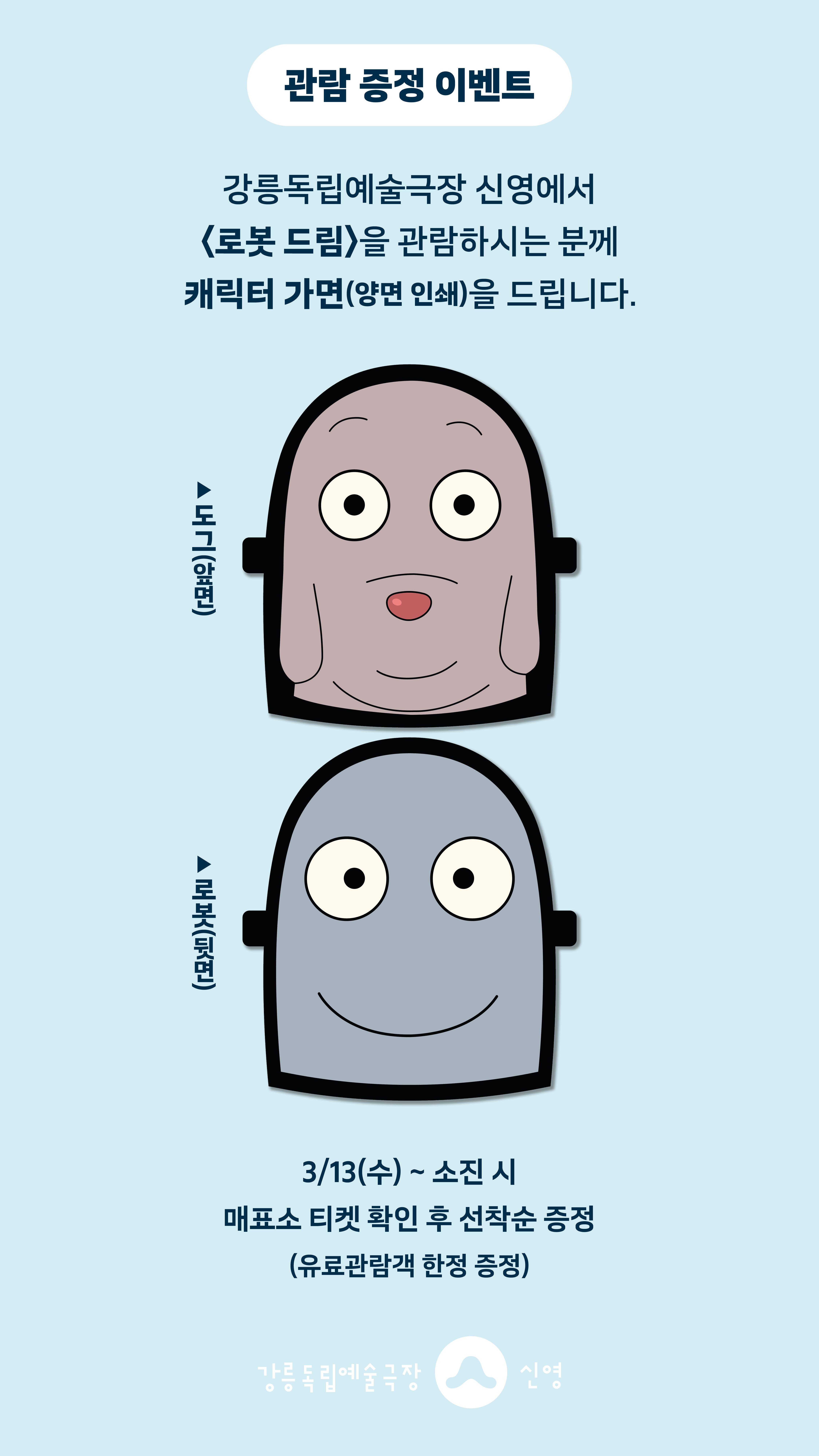 강릉독립예술극장 신영에서 <로봇 드림>을 관람하시는 분께 선착순으로 캐릭터 가면(도그, 로봇 / 양면 인쇄)을 드립니다.
