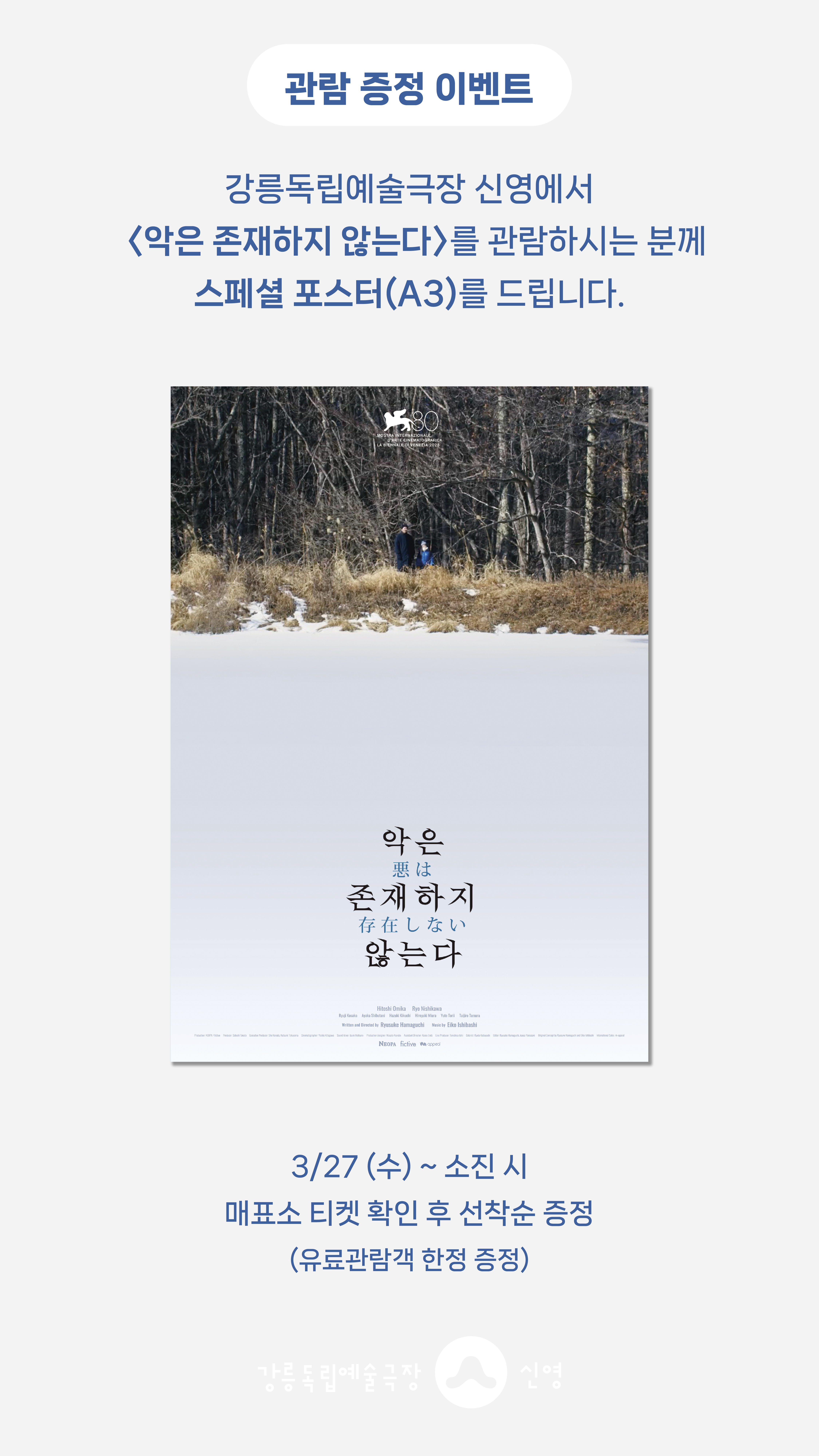 강릉독립예술극장 신영에서 <악은 존재하지 않는다>을 관람하시는 분께 선착순으로 <악은 존재하지 않는다> 스페셜 포스터(A3)를 드립니다.✔️ 증정품: <악은 존재하지 않는다> 스페셜 포스터(A3✔️ 이벤트 기간: 3월 27일(수) ~ 경품 소진 시 이벤트 종료✔️ 증정 방법 : 매표소 티켓 확인 후 선착순 증정