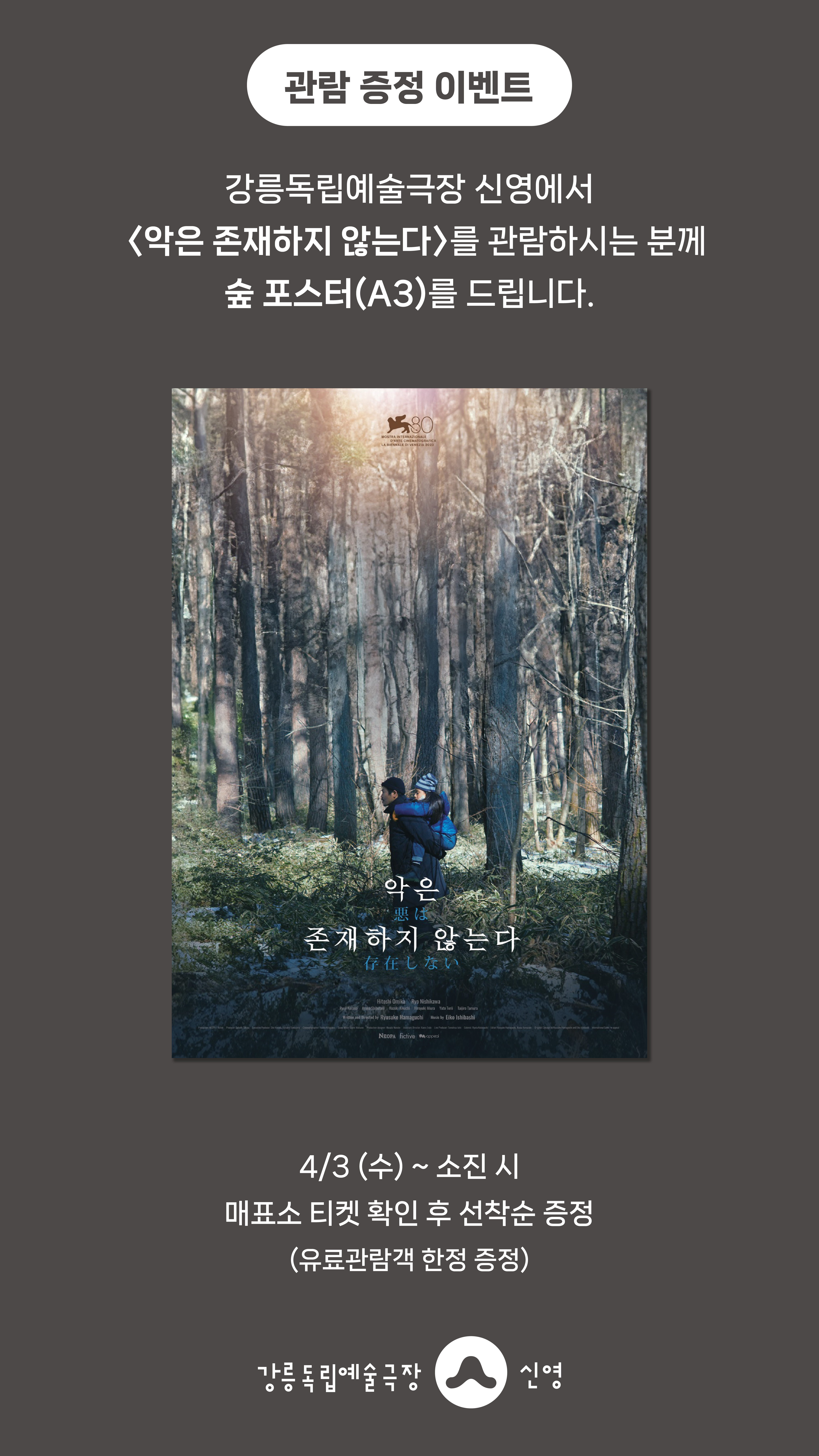 강릉독립예술극장 신영에서 <악은 존재하지 않는다>을 관람하시는 분께 선착순으로 <악은 존재하지 않는다> 숲 포스터(A3)를 드립니다.✔️ 증정품: <악은 존재하지 않는다> 숲 포스터(A3)✔️ 이벤트 기간: 4월 3일(수) ~ 경품 소진 시 이벤트 종료✔️ 증정 방법 : 매표소 티켓 확인 후 선착순 증정