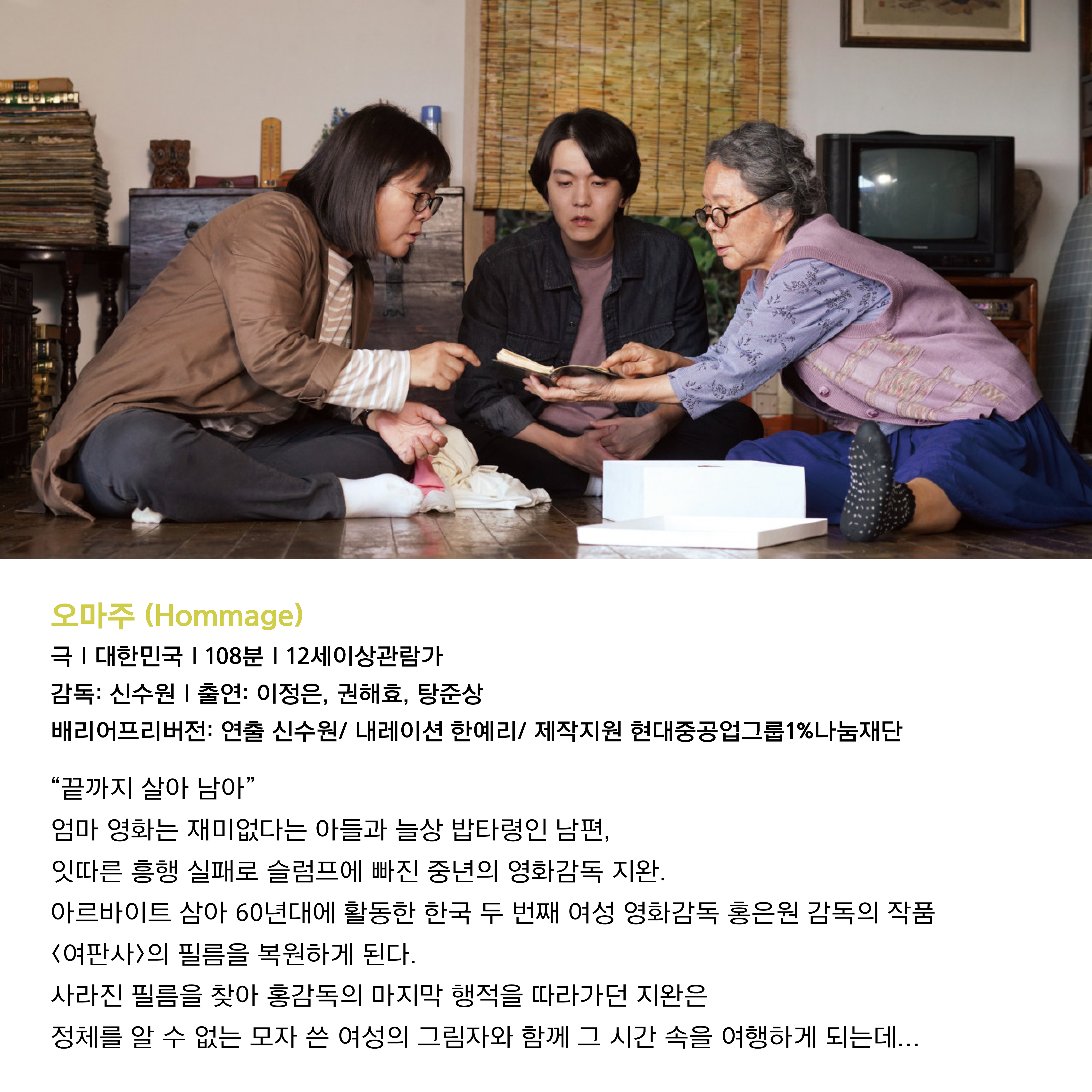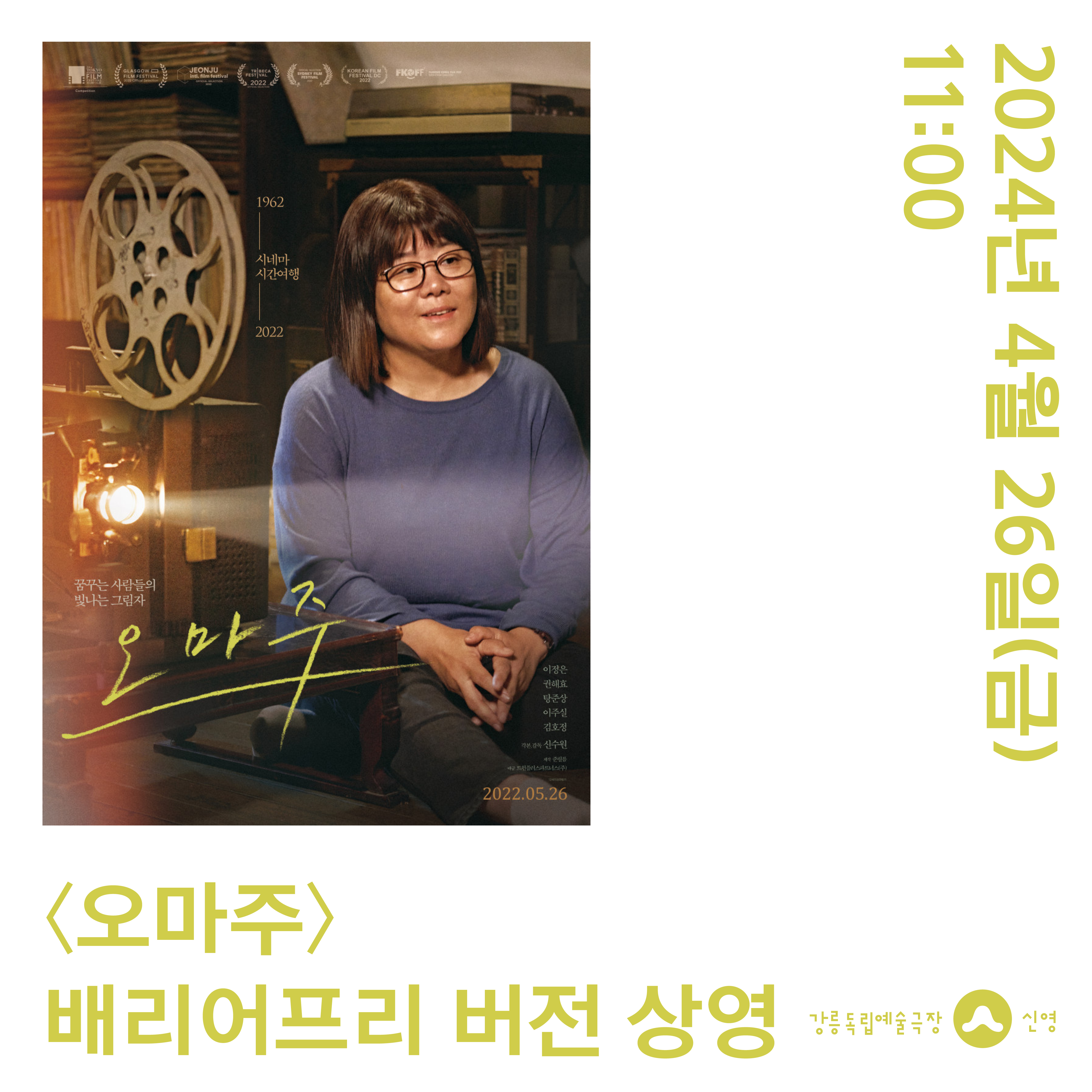 강릉독립예술극장 신영에서는 월 1회 배리어프리 영화를 상영합니다. 4월의 배리어프리 영화는 ⟨오마주⟩입니다. 한국 1세대 여성 영화인 홍은원 감독의 ‘여판사’를 복원하게 된 중년 여성감독 ‘지완(이정은)’이 알 수 없는 시간 속으로 빠져들어 여행하며 벌어지는 이야기를 그린 작품입니다. 현재와 과거를 넘나드는 시네마 여행을 위트 있고 판타스틱하게 그려낸 아트판타지버스터 〈오마주〉를 신영에서 다시 만나보세요.