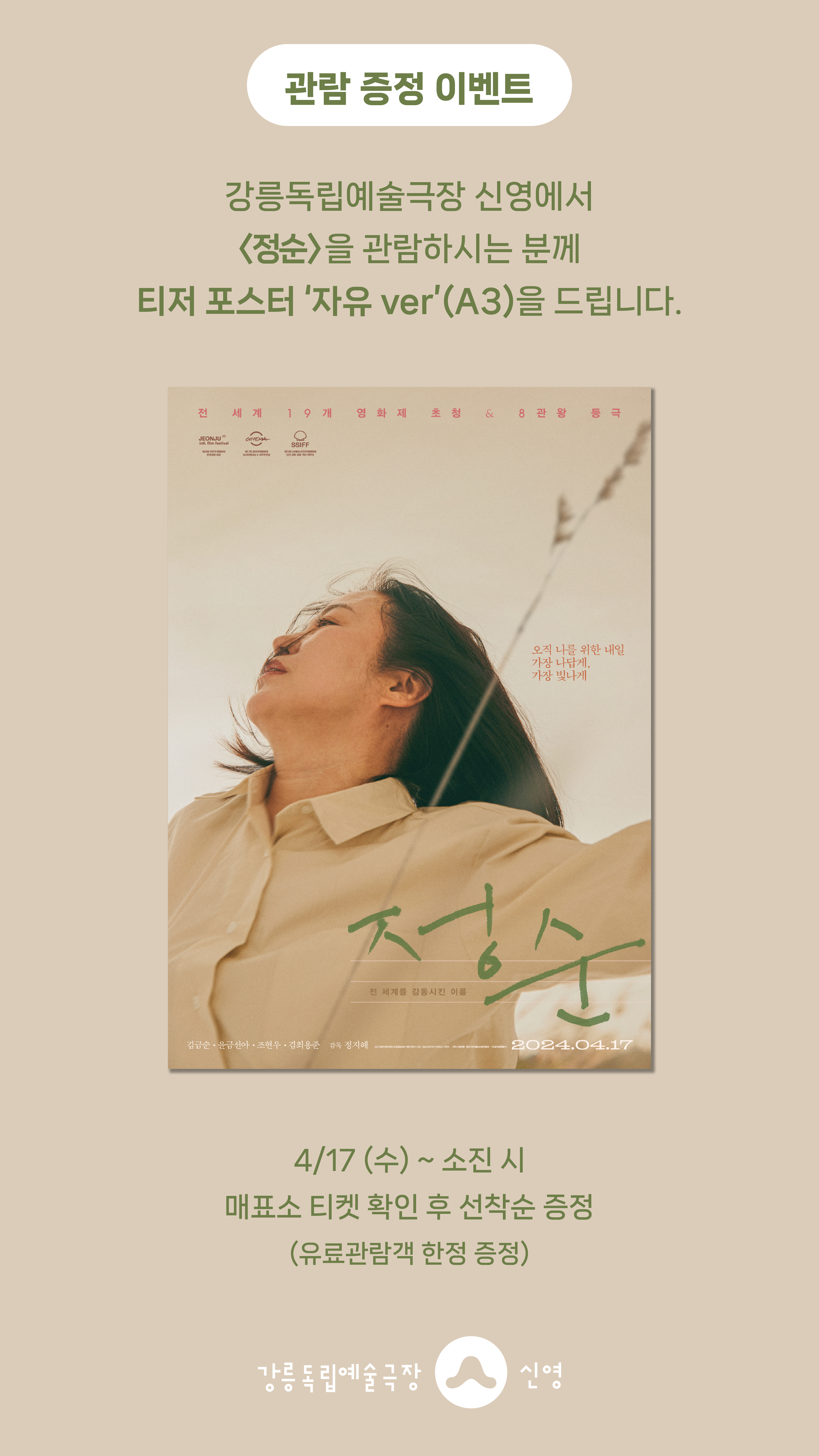 강릉독립예술극장 신영에서 <정순>을 관람하시는 분께 선착순으로 <정순> 티저 포스터 '자유 ver'(A3)을 드립니다.