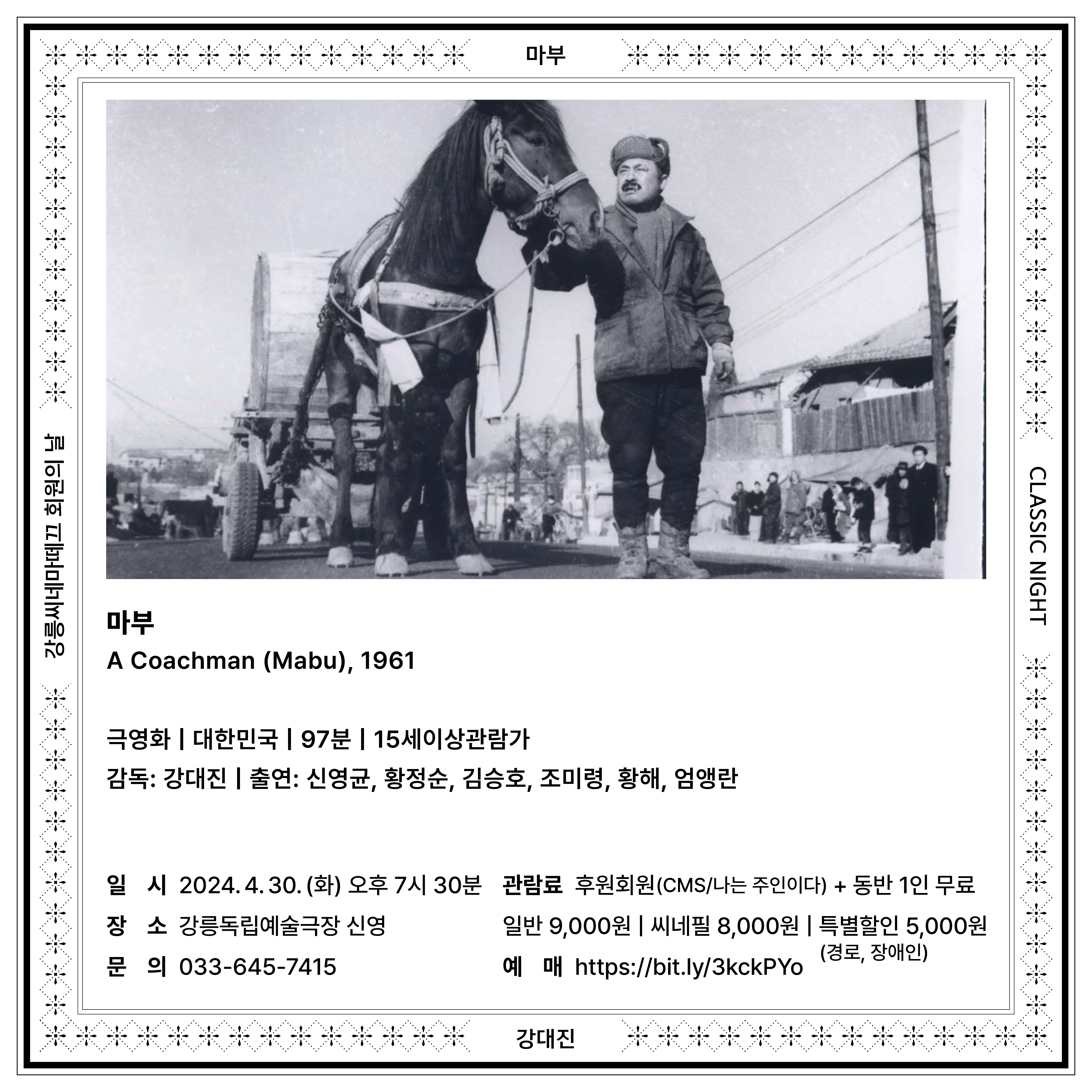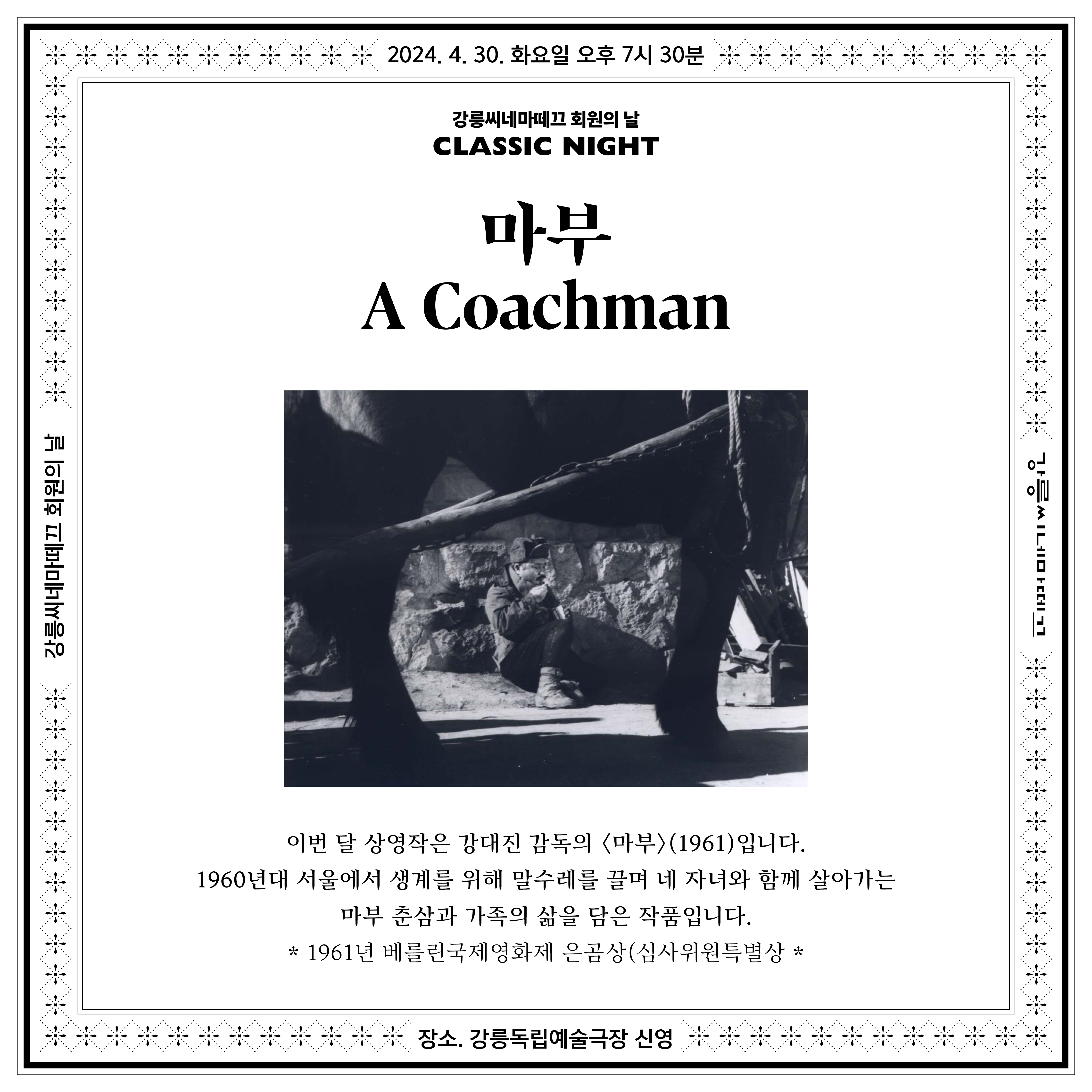 이번 달은 강대진 감독의 1961년 작품 〈마부〉를 함께 봅니다. 1960년대 서울에서 생계를 위해 말수레를 끌며 네 자녀와 함께 힘겹게 하루하루 살아가는 마부 춘삼과 그의 가족의 삶을 담았으며, 당대 서민의 삶을 세심히 그려낸 작품입니다. 1961년 제11회 베를린국제영화제 은곰상(심사위원특별상) 수상작으로, 한국영화사의 손꼽히는 걸작입니다.