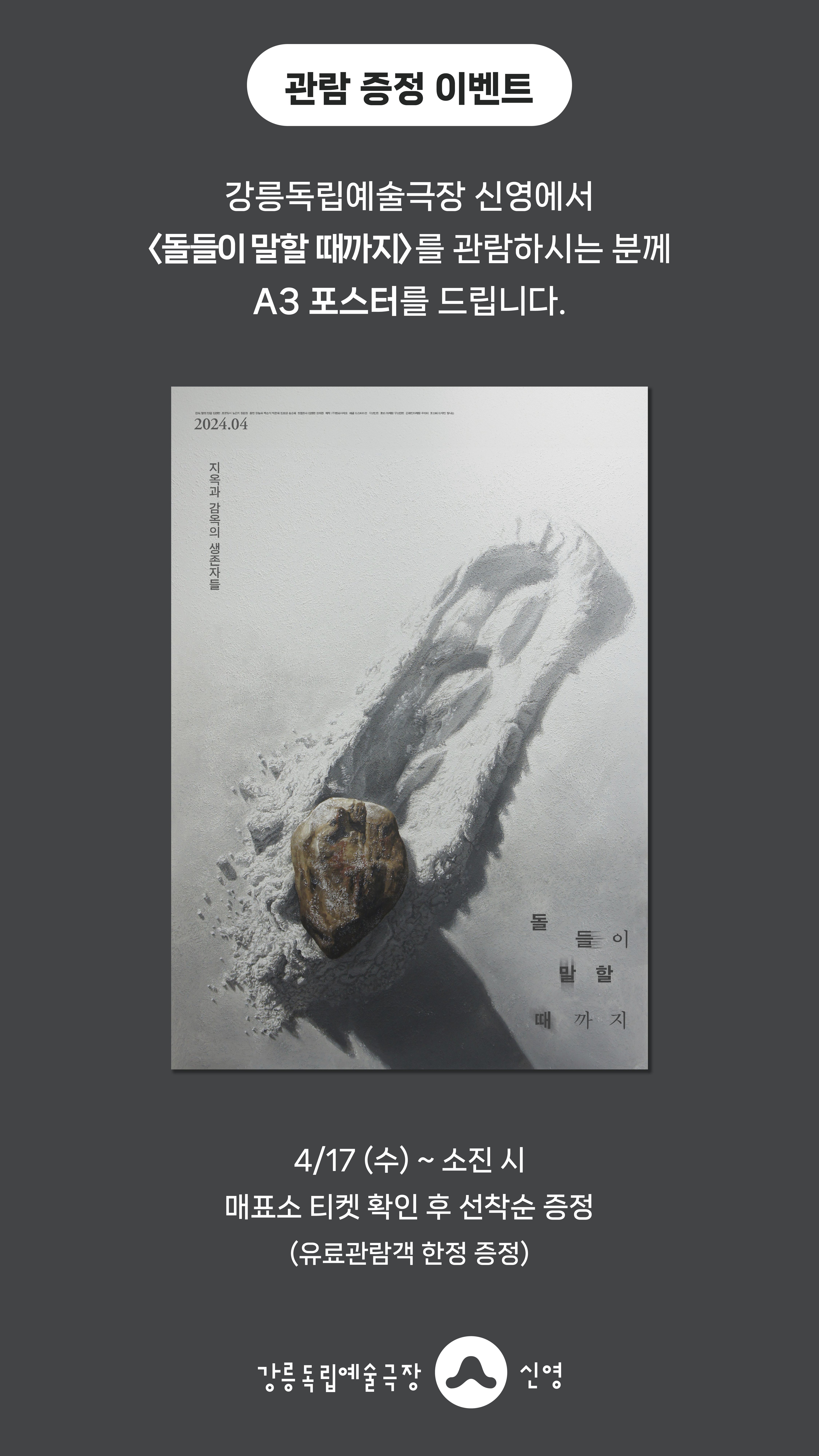 강릉독립예술극장 신영에서 <돌들이 말할 때까지>를 관람하시는 분께 선착순으로 <돌들이 말할 때까지> A3 포스터를 드립니다.