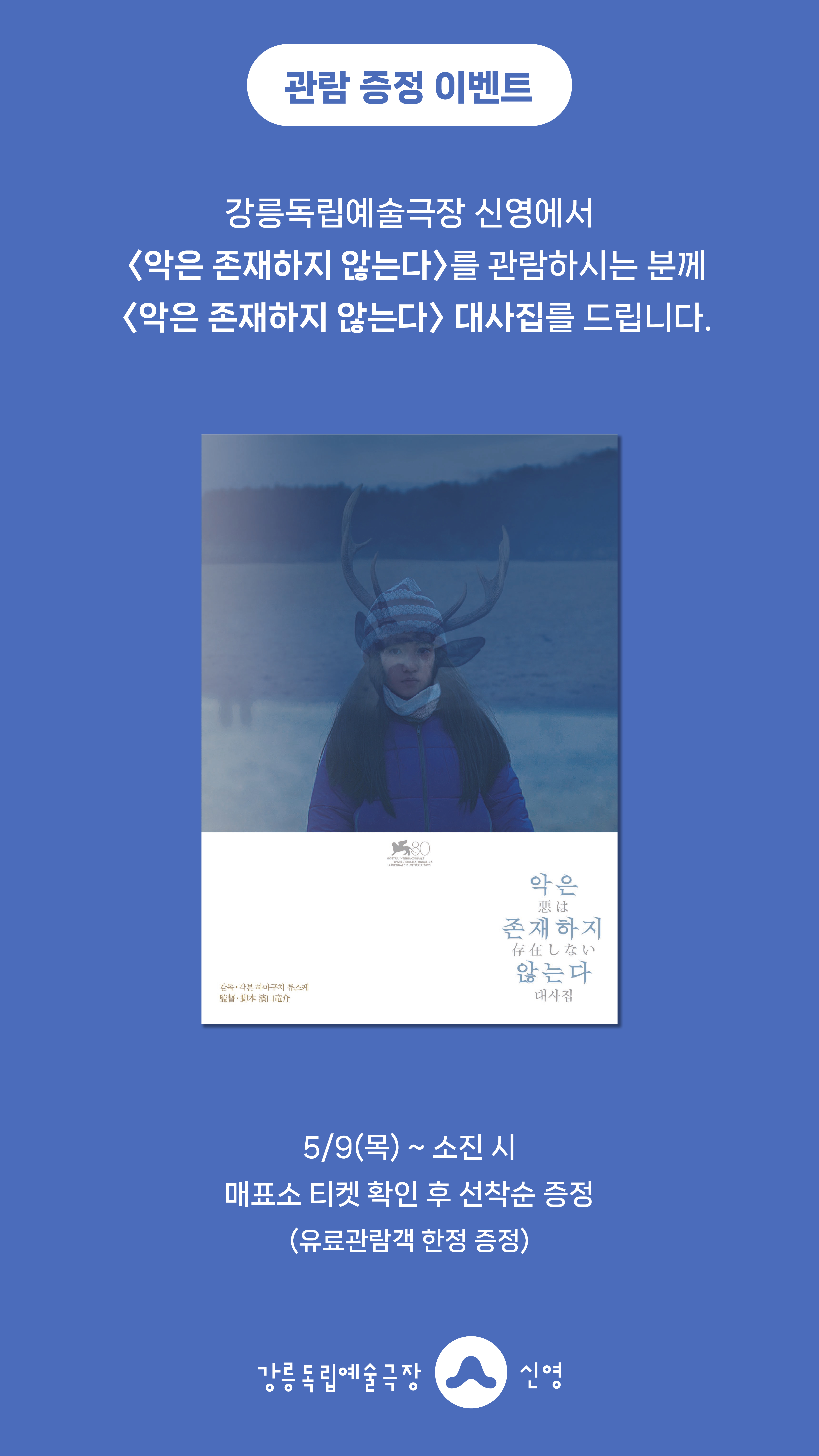 강릉독립예술극장 신영에서 <악은 존재하지 않는다>을 관람하시는 분께 선착순으로 <악은 존재하지 않는다> 대사집을 드립니다.