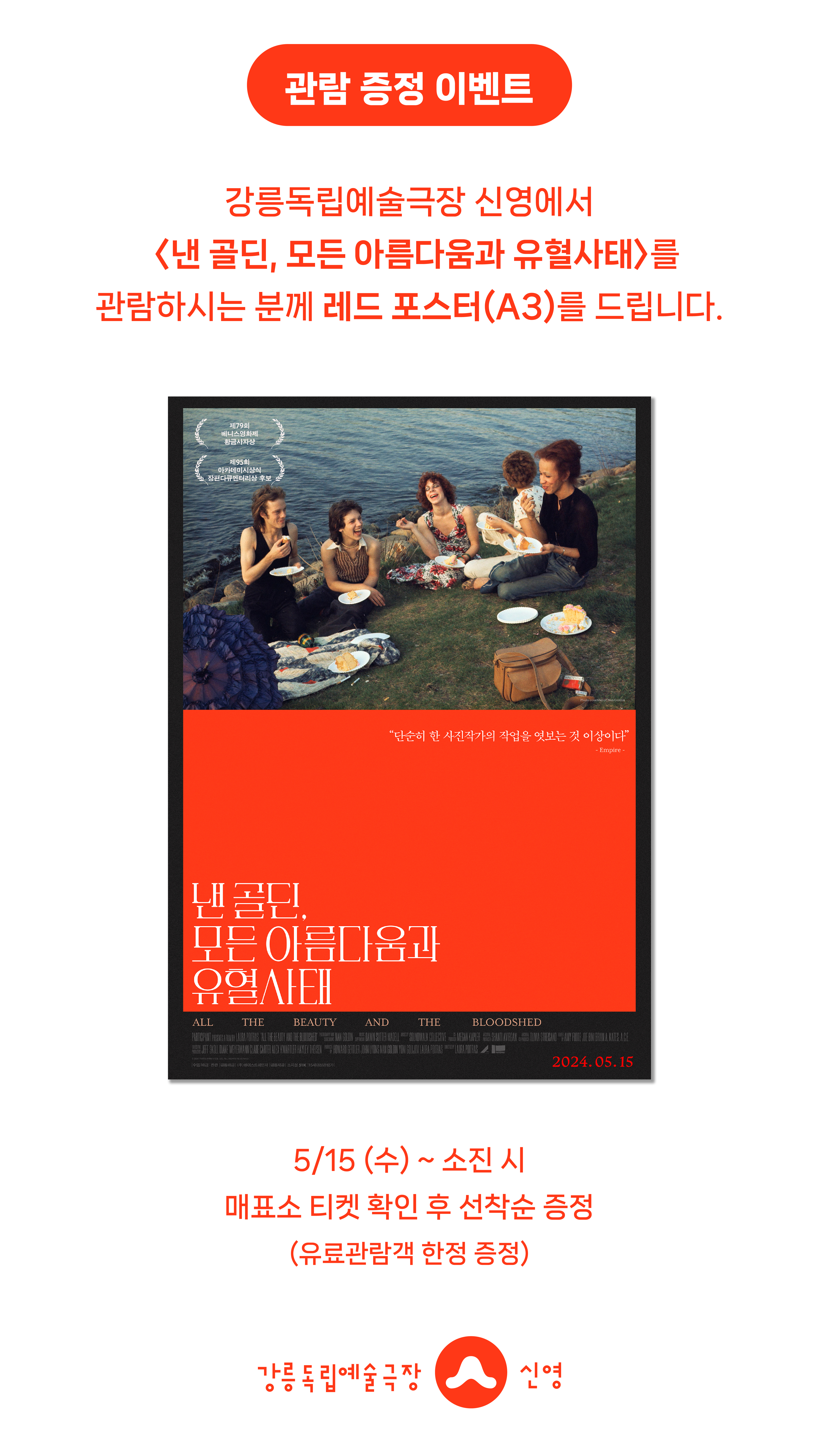 강릉독립예술극장 신영에서 <낸 골딘, 모든 아름다움과 유혈사태>를 관람하시는 분께 선착순으로 <낸 골딘, 모든 아름다움과 유혈사태> 레드 포스터(‘에스플라네이드에서의 소풍’ ver.)를 드립니다.