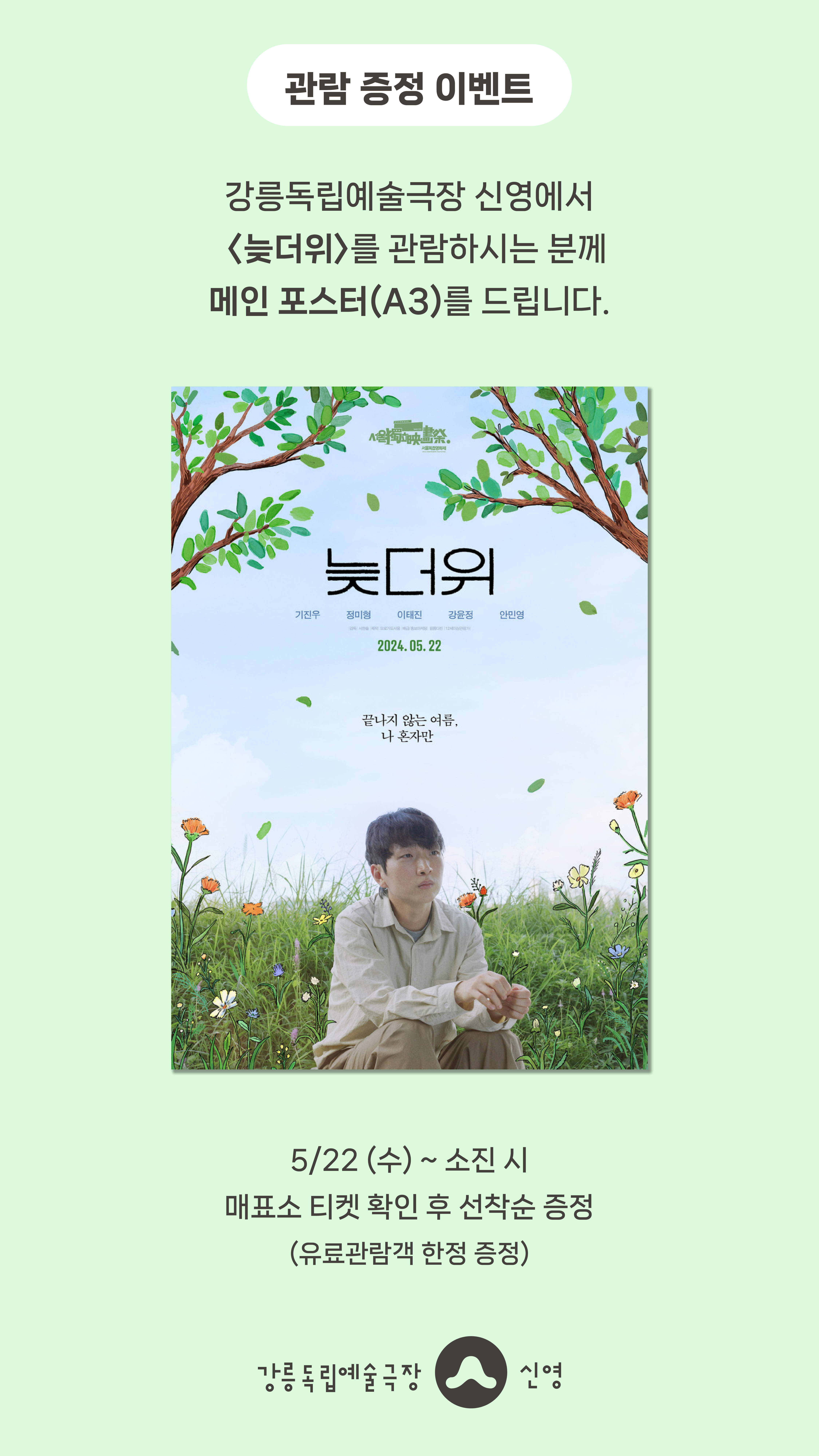 강릉독립예술극장 신영에서 <늦더위>를 관람하시는 분께 선착순으로 <늦더위> 메인 포스터(A3)를 드립니다.