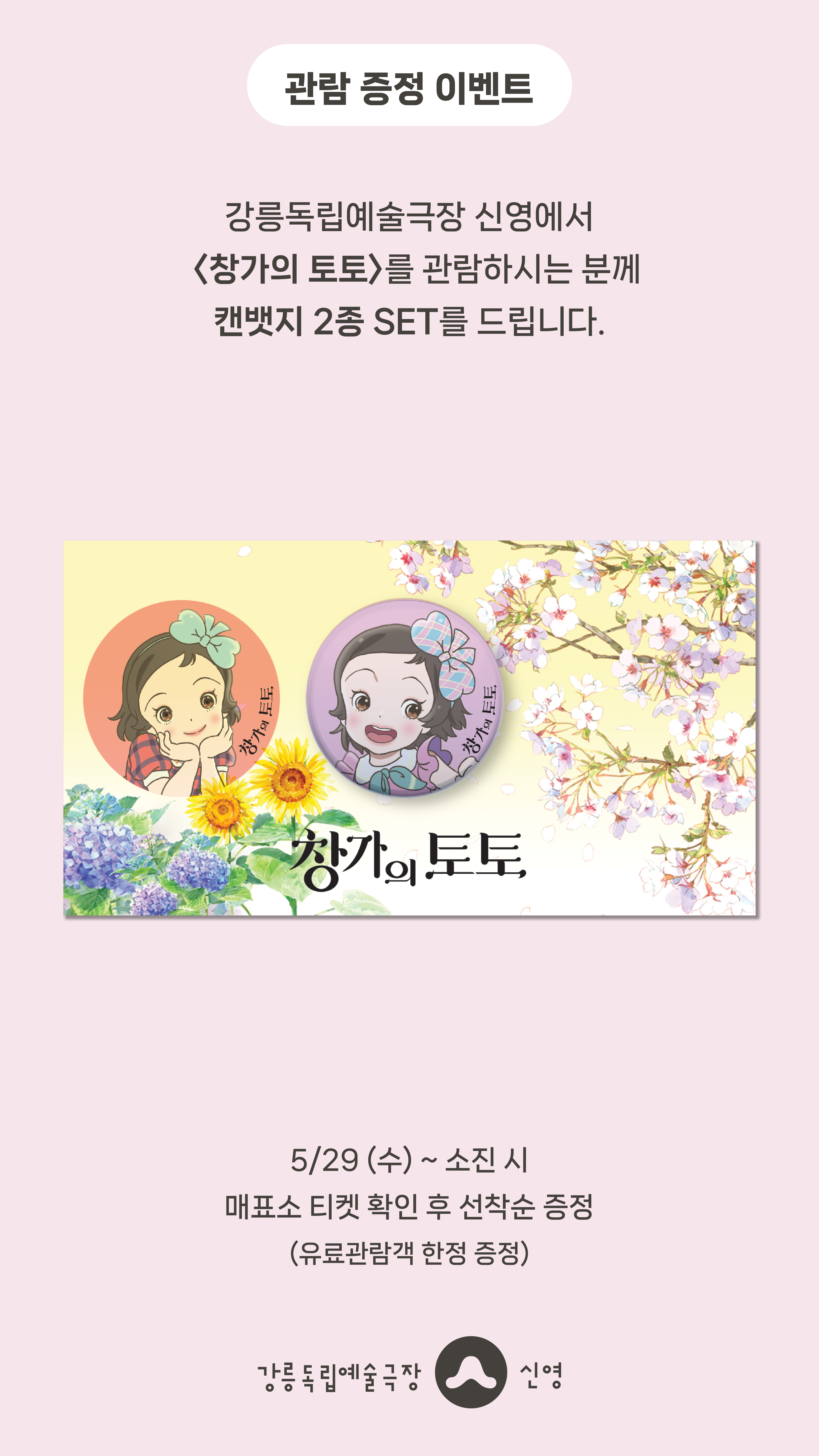 강릉독립예술극장 신영에서 <창가의 토토>를 관람하시는 분께 선착순으로 <창가의 토토> 캔뱃지(2종 SET)를 드립니다.