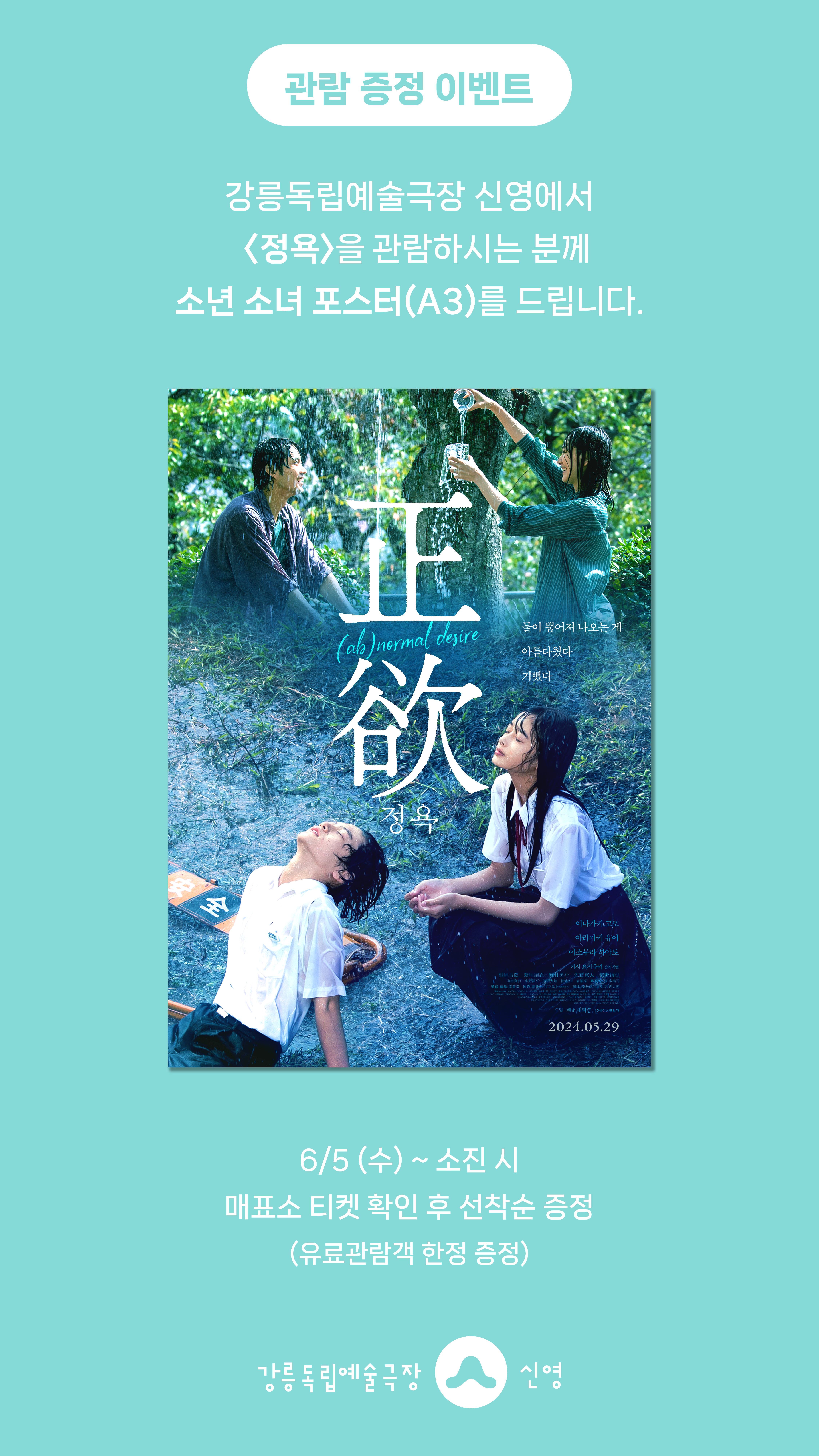 강릉독립예술극장 신영에서 <정욕>을 관람하시는 분께 선착순으로 <정욕> 소년 소녀 포스터(A3)를 드립니다.