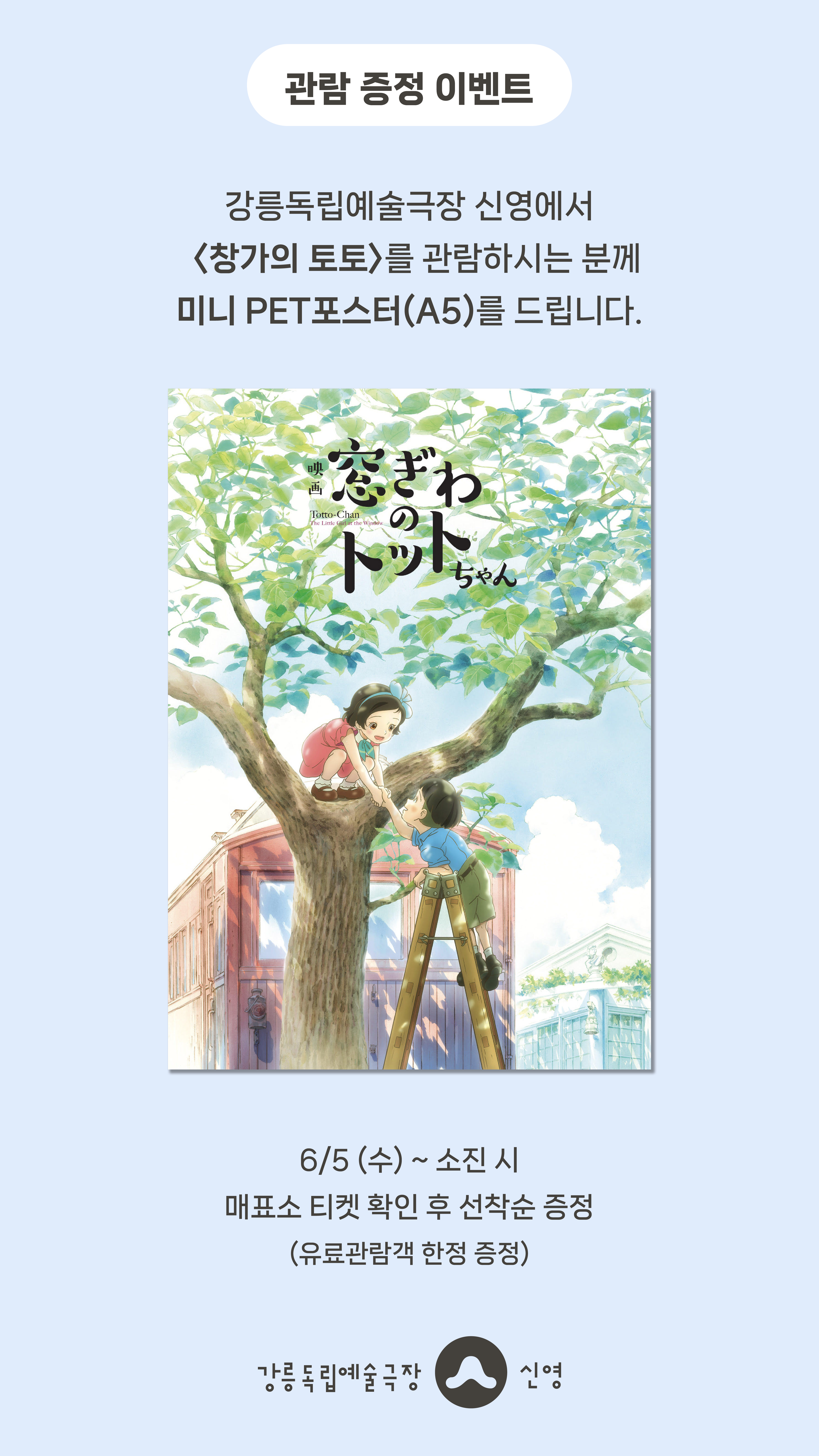 강릉독립예술극장 신영에서 <창가의 토토>를 관람하시는 분께 선착순으로 <창가의 토토> 미니 PET포스터(A5)를 드립니다.