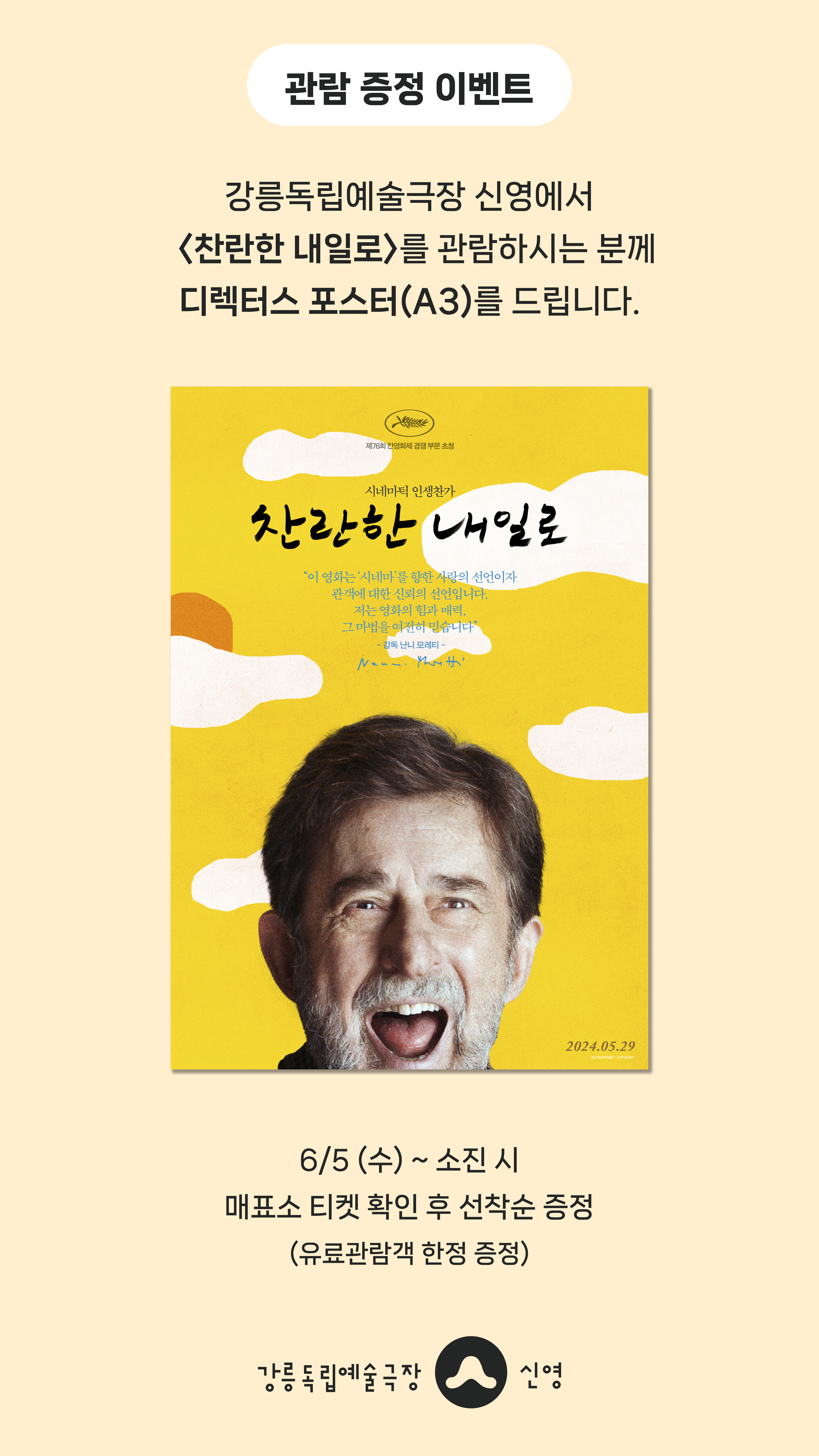 강릉독립예술극장 신영에서 <찬란한 내일로>를 관람하시는 분께 선착순으로 <찬란한 내일로> 디렉터스 포스터(A3)를 드립니다.