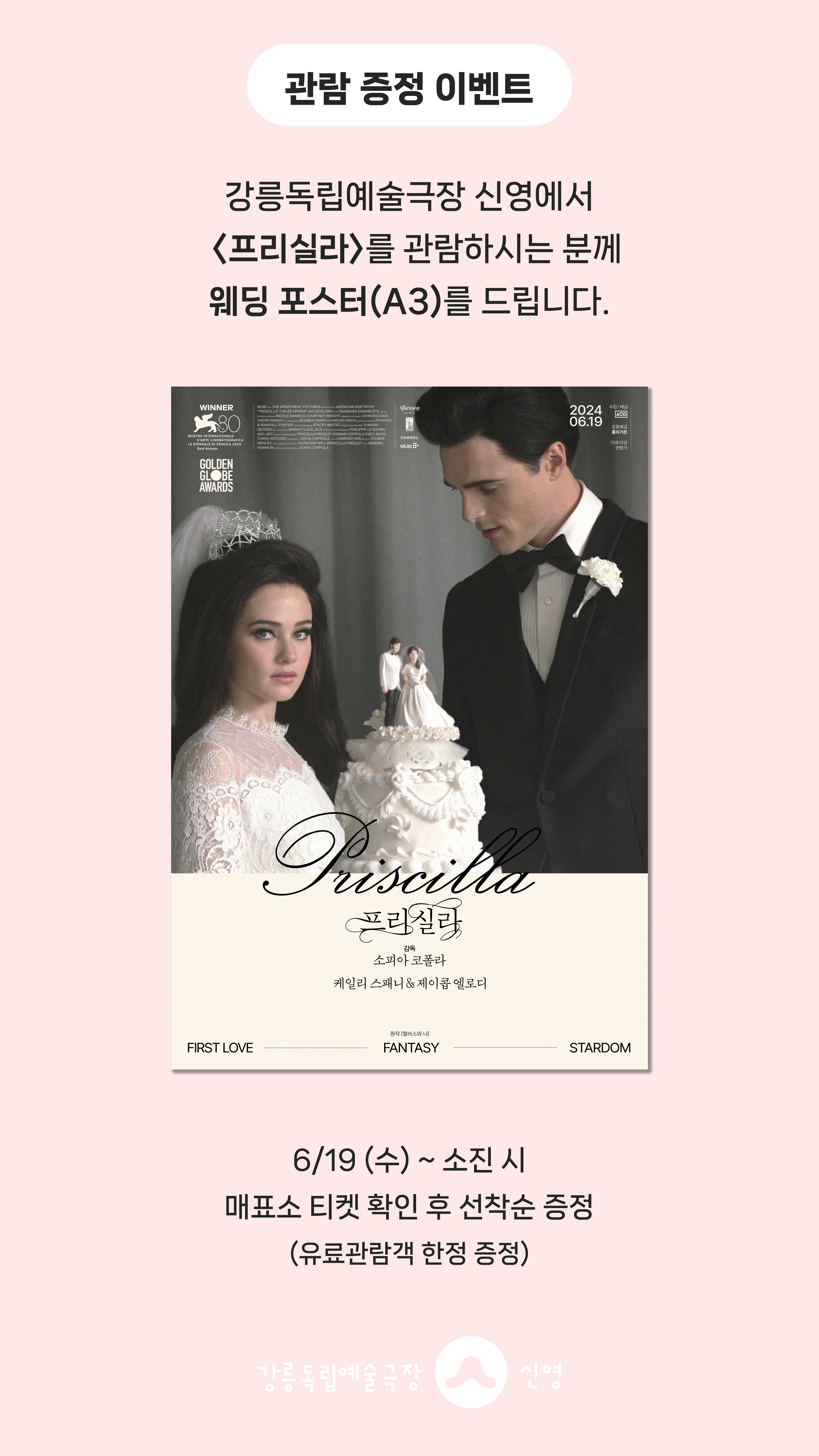 강릉독립예술극장 신영에서 <프리실라>를 관람하시는 분께 선착순으로 <프리실라> 웨딩 포스터(A3)를 드립니다.