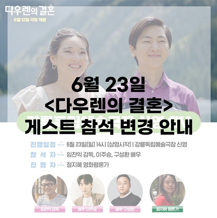 6월 23일(일) 오후 2시에 예정된 <다우렌의 결혼> 씨네토크 관련하여 게스트의 사정상 구성환 배우는 불참하게 되었습니다. 관객 여러분의 양해 부탁드립니다.