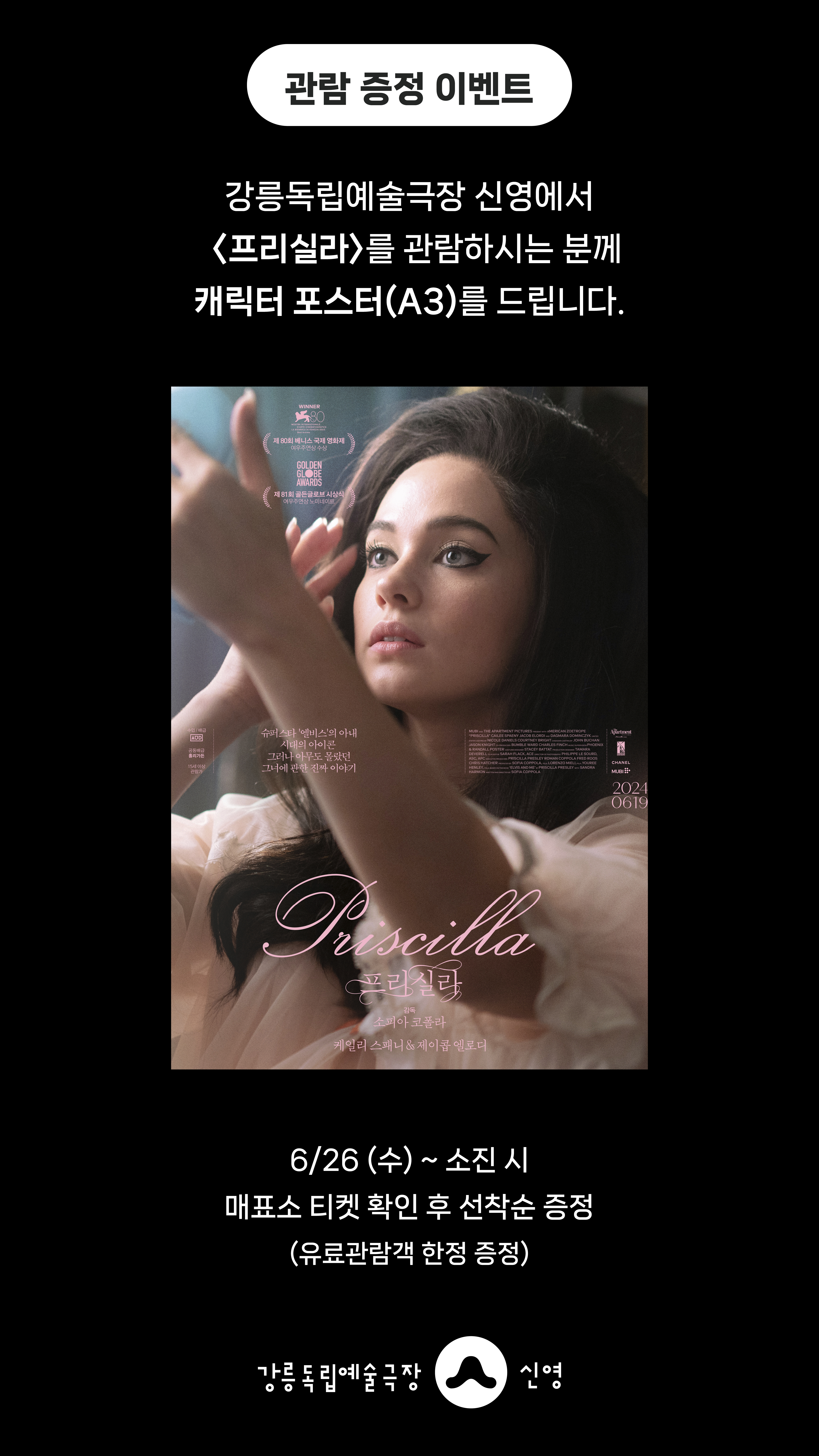 강릉독립예술극장 신영에서 <프리실라>를 관람하시는 분께 선착순으로 <프리실라> 캐릭터 포스터(A3)를 드립니다.
