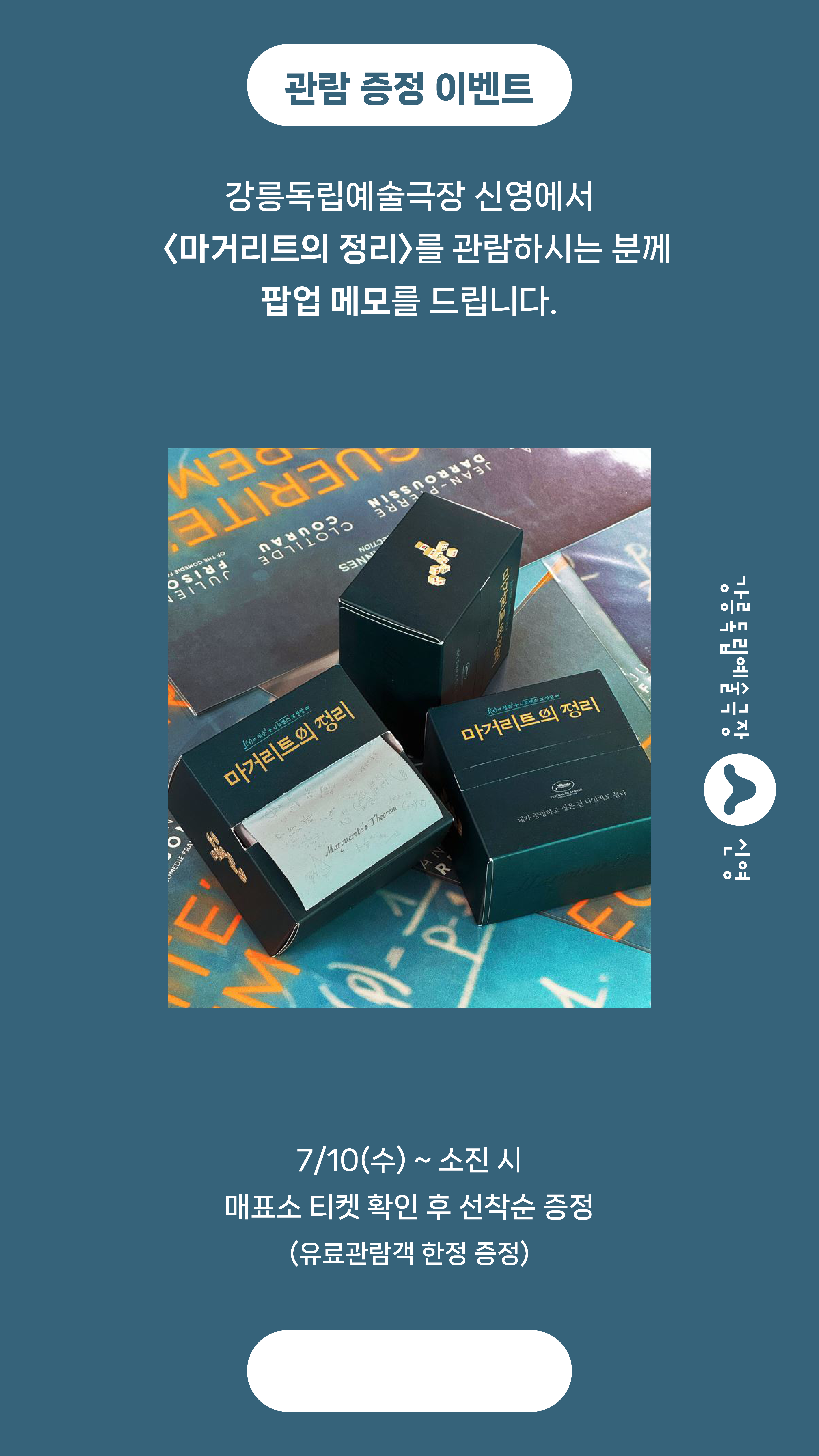 강릉독립예술극장 신영에서 <마거리트의 정리>를 관람하시는 분께 선착순으로 <마거리트의 정리> 팝업 메모를 드립니다.