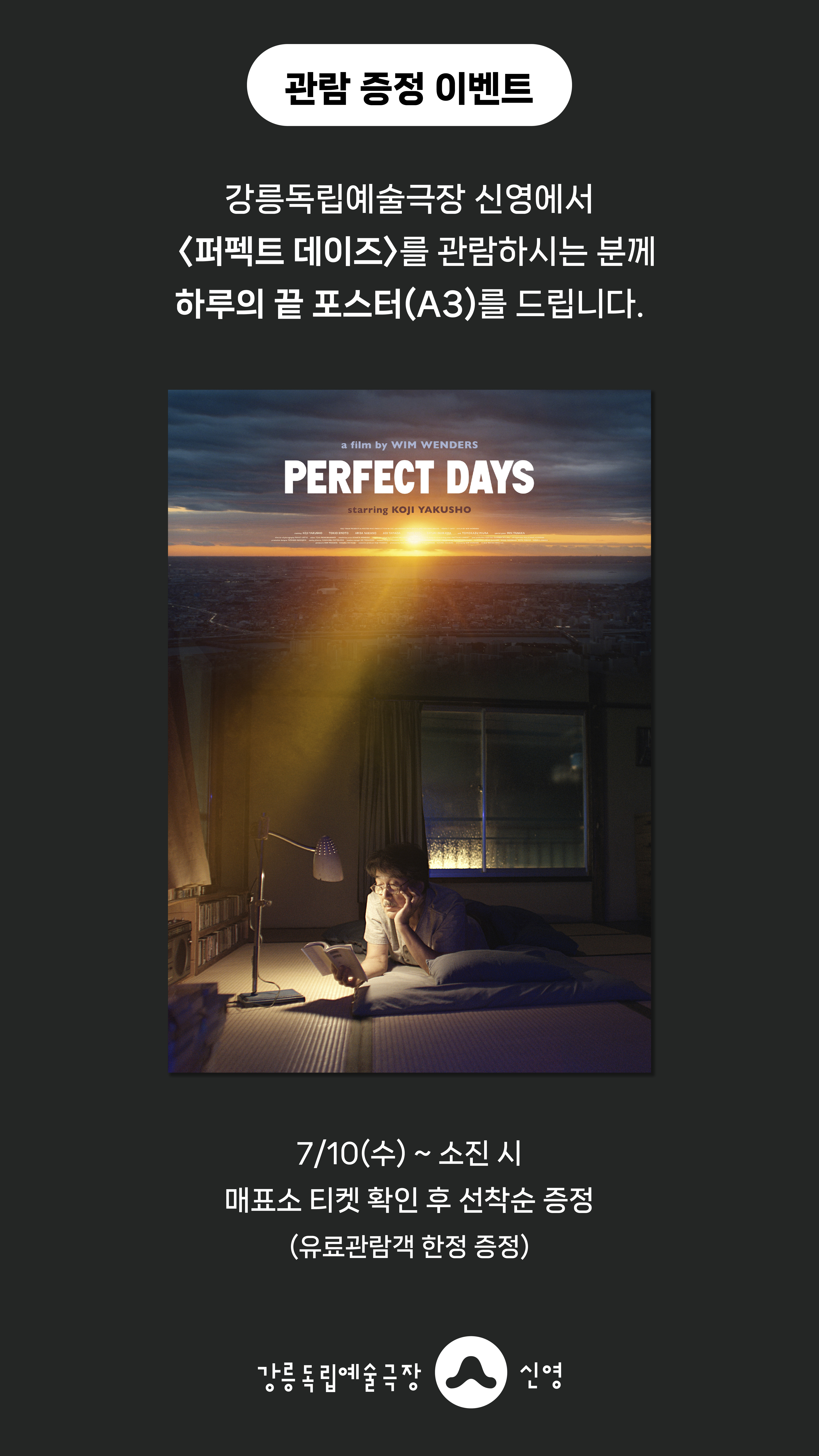 강릉독립예술극장 신영에서 <퍼펙트 데이즈>를 관람하시는 분께 선착순으로 <퍼펙트 데이즈> 하루의 끝 포스터(A3)를 드립니다.✔️ 증정품: <퍼펙트 데이즈> 하루의 끝 포스터(A3)✔️ 이벤트 기간: 7월 10일(수) ~ 경품 소진 시 이벤트 종료✔️ 증정 방법: 매표소 티켓 확인 후 선착순 증정 🎟️ 인터넷 예매 (좌석선택 가능) https://bit.ly/3kckPYo