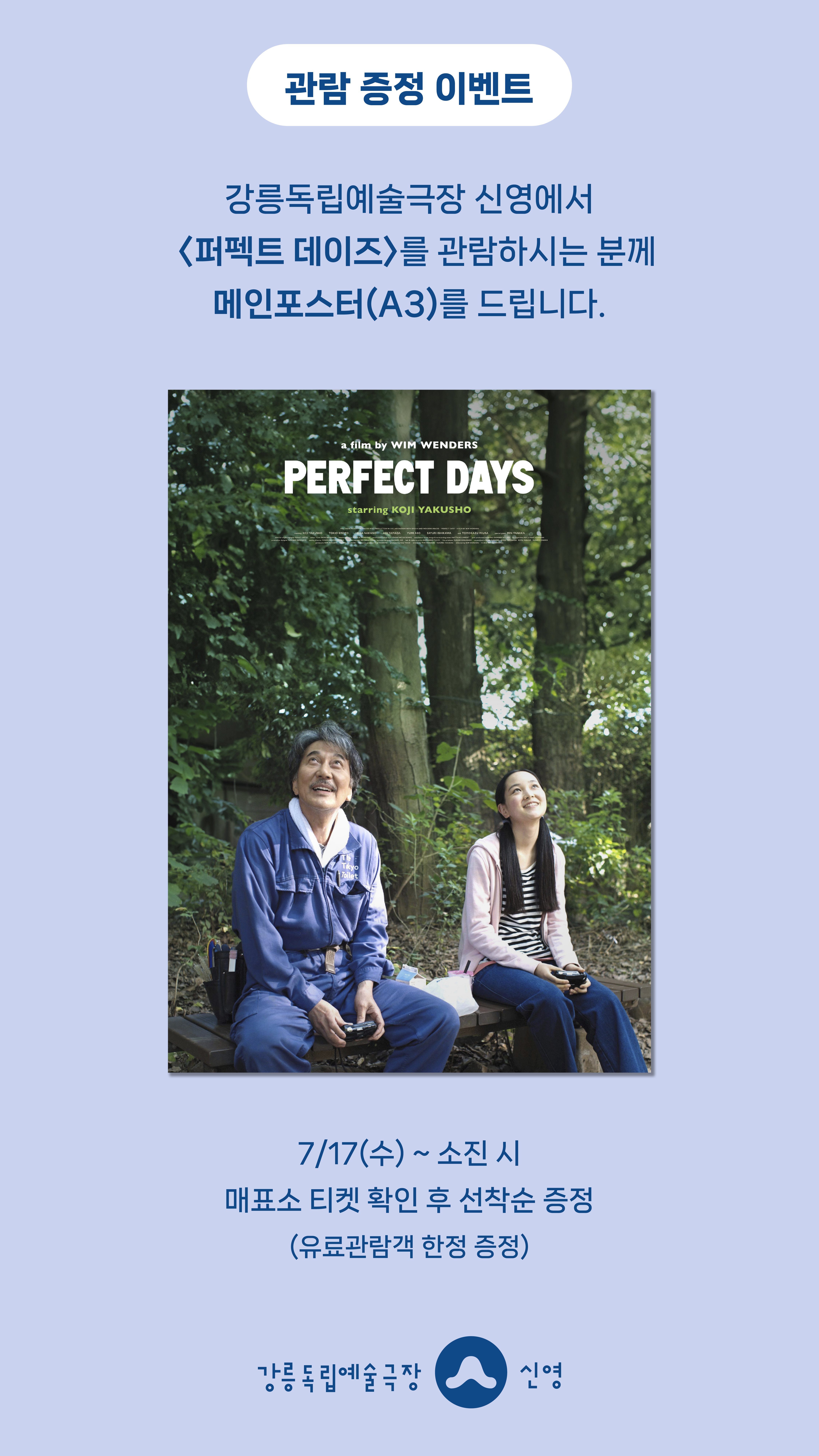 강릉독립예술극장 신영에서 <퍼펙트 데이즈>를 관람하시는 분께 선착순으로 <퍼펙트 데이즈> 메인포스터(A3)를 드립니다.