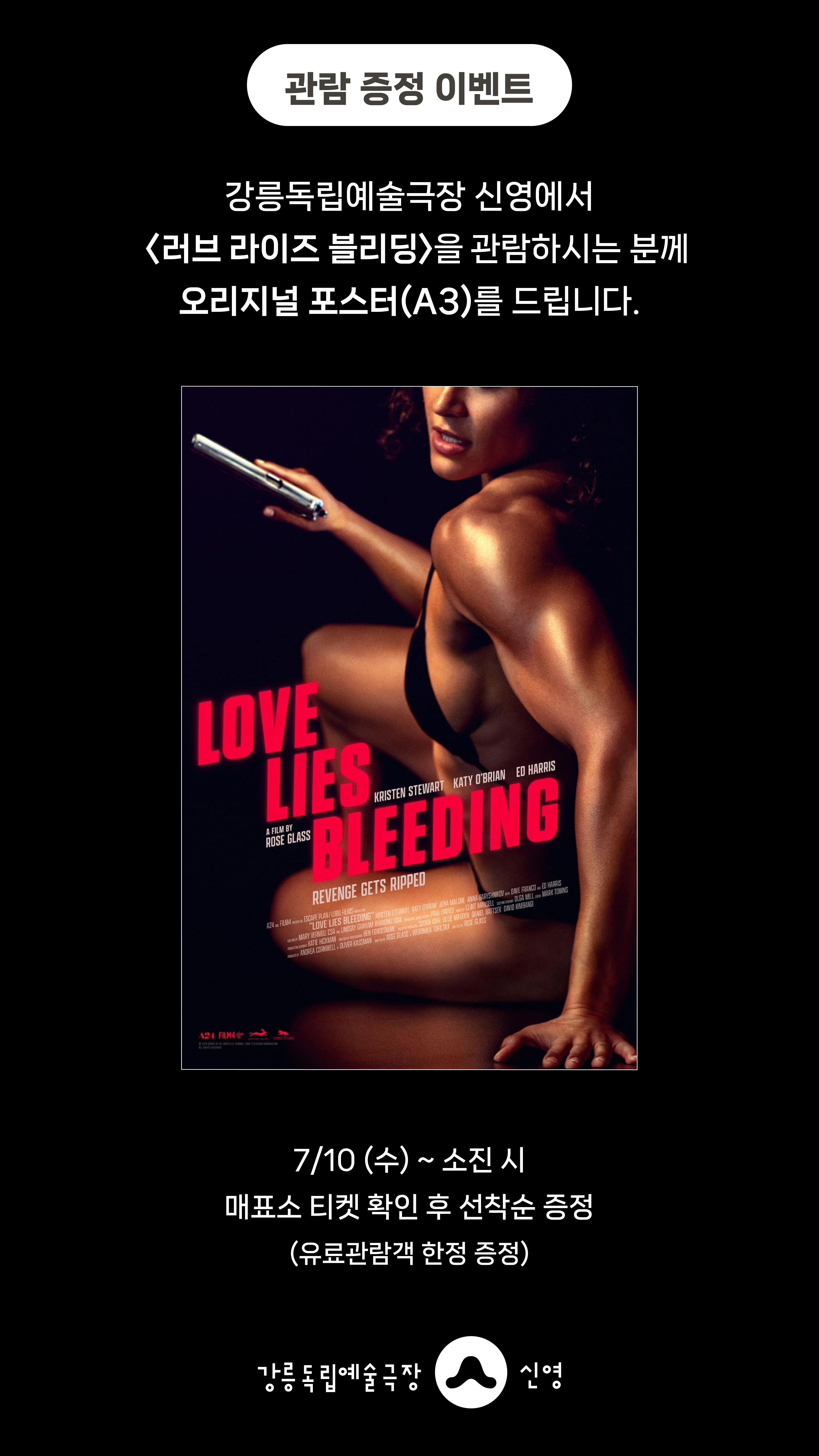 강릉독립예술극장 신영에서 <러브 라이즈 블리딩>을 관람하시는 분께 선착순으로 <러브 라이즈 블리딩> 오리지널 포스터(A3)를 드립니다.