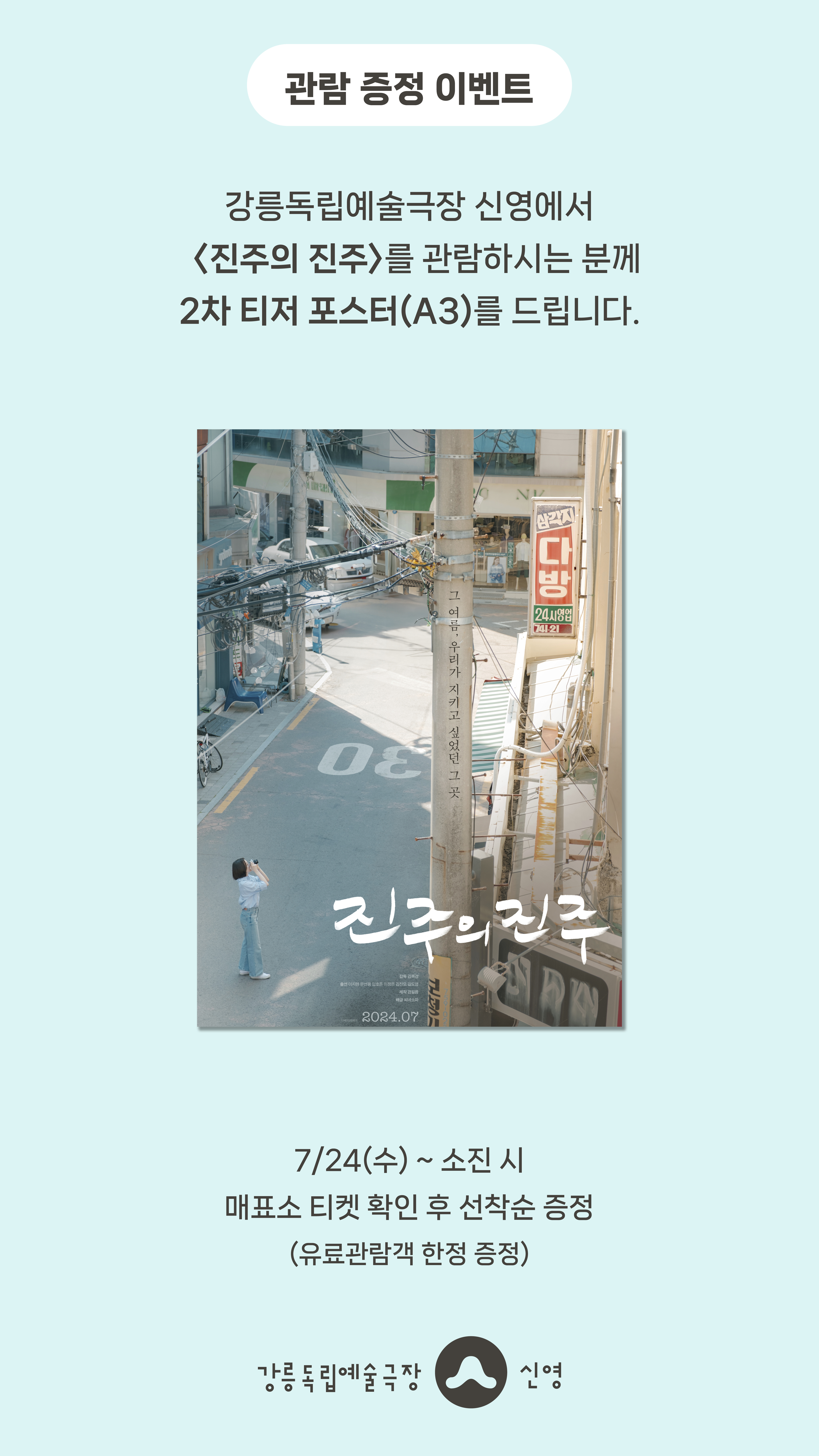 강릉독립예술극장 신영에서 <진주의 진주>를 관람하시는 분께 선착순으로 <진주의 진주> 2차 티저 포스터(A3)를 드립니다.