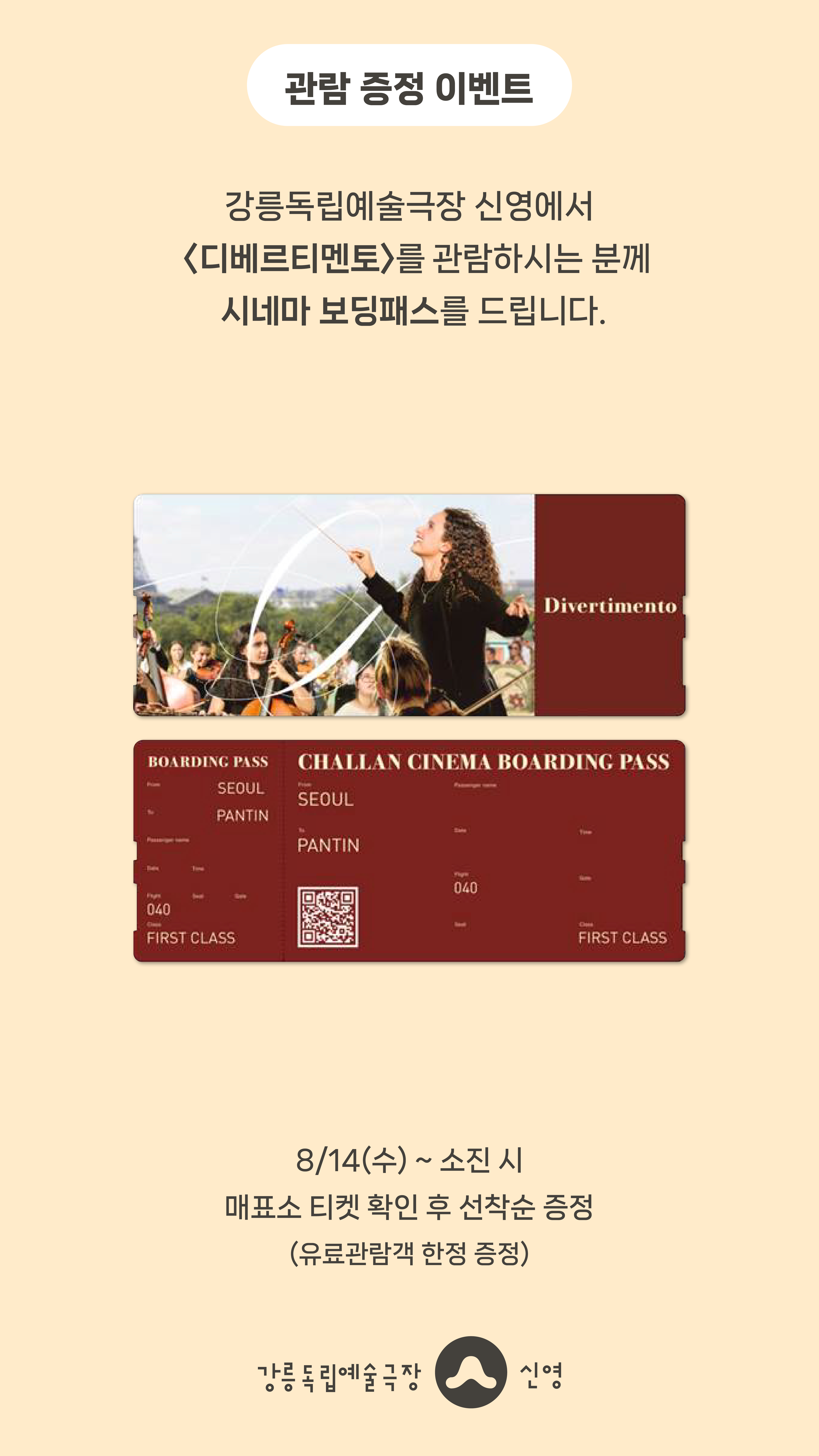 강릉독립예술극장 신영에서 <디베르티멘토>를 관람하시는 분께 선착순으로 시네마 보딩패스를 드립니다.