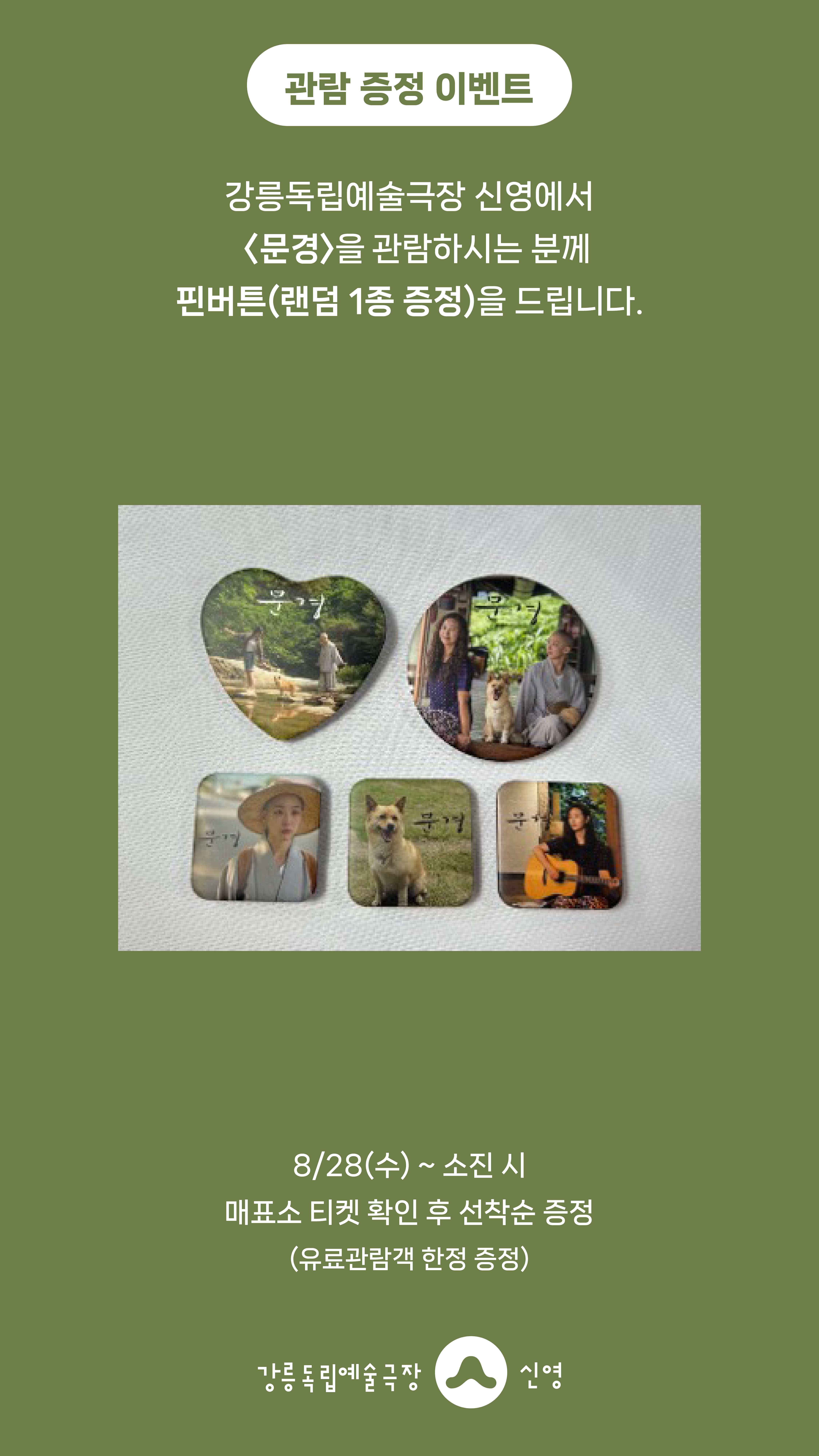 강릉독립예술극장 신영에서 <문경>을 관람하시는 분께 선착순으로 핀버튼(랜덤 1종 증정)을 드립니다.