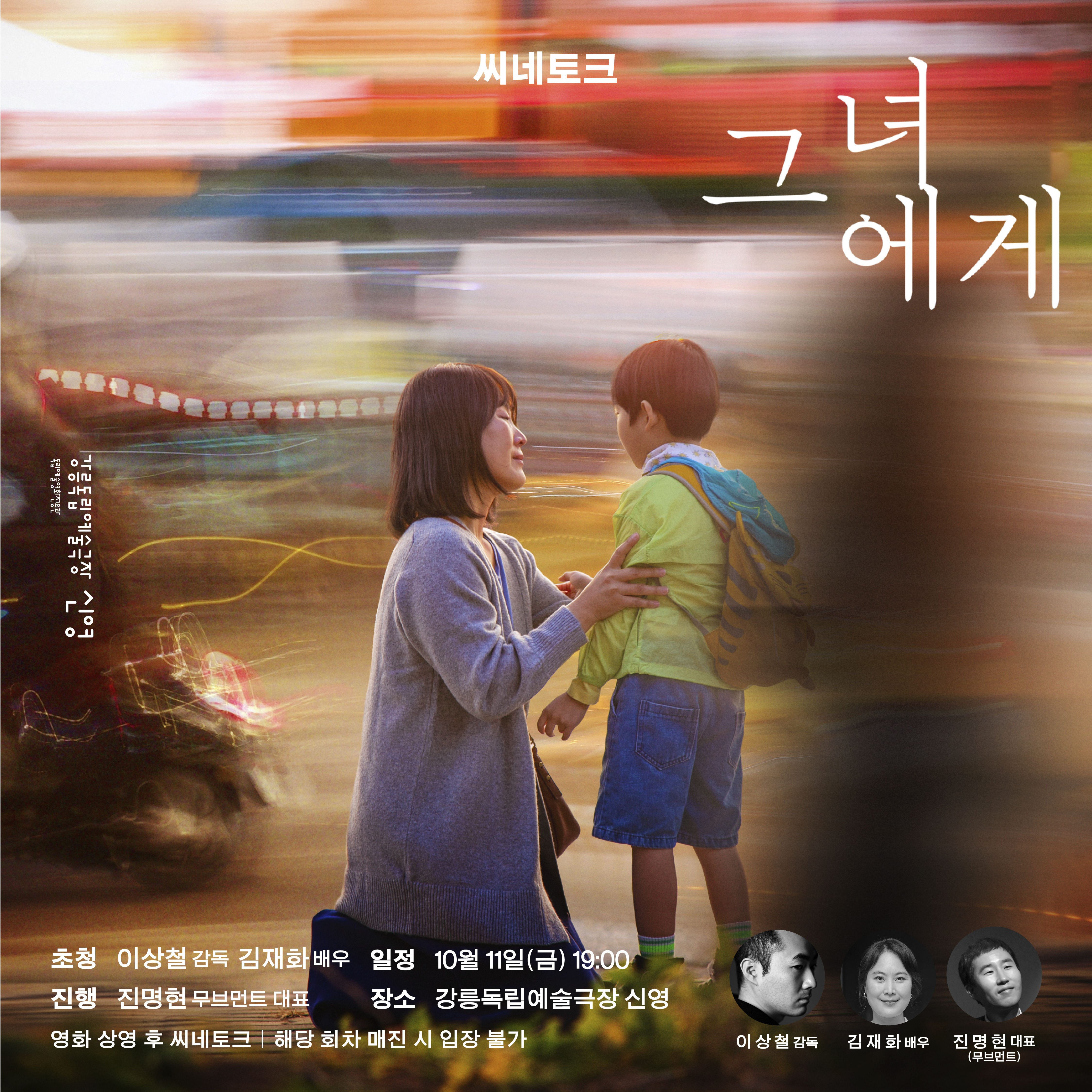 영화 상영 후 <그녀에게>를 연출한 이상철 감독, 주인공인 신문사 정치부 기자 '상연'역을 연기한 김재화 배우를 초청하여, 영화 이야기를 나눕니다. 많은 관심 바랍니다.