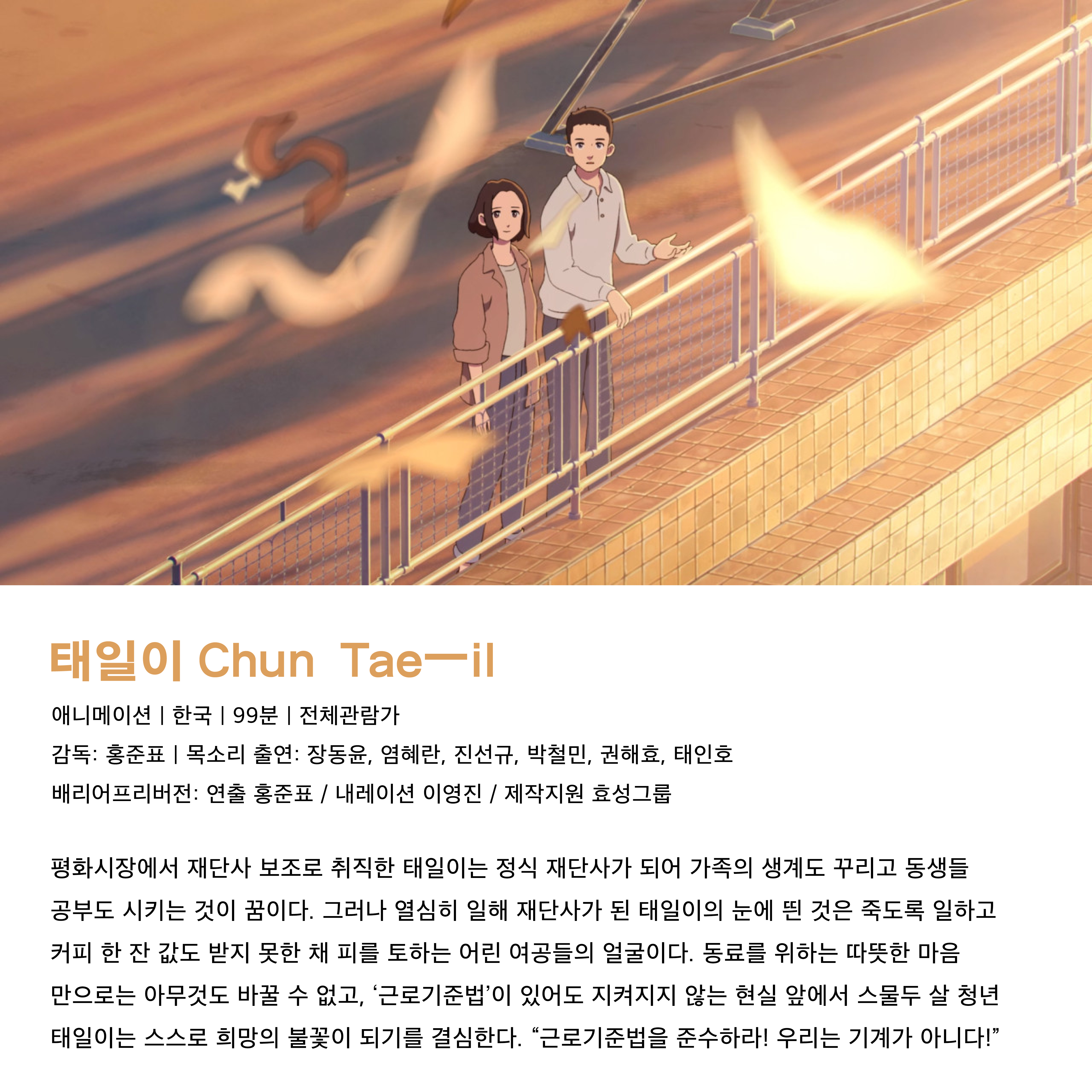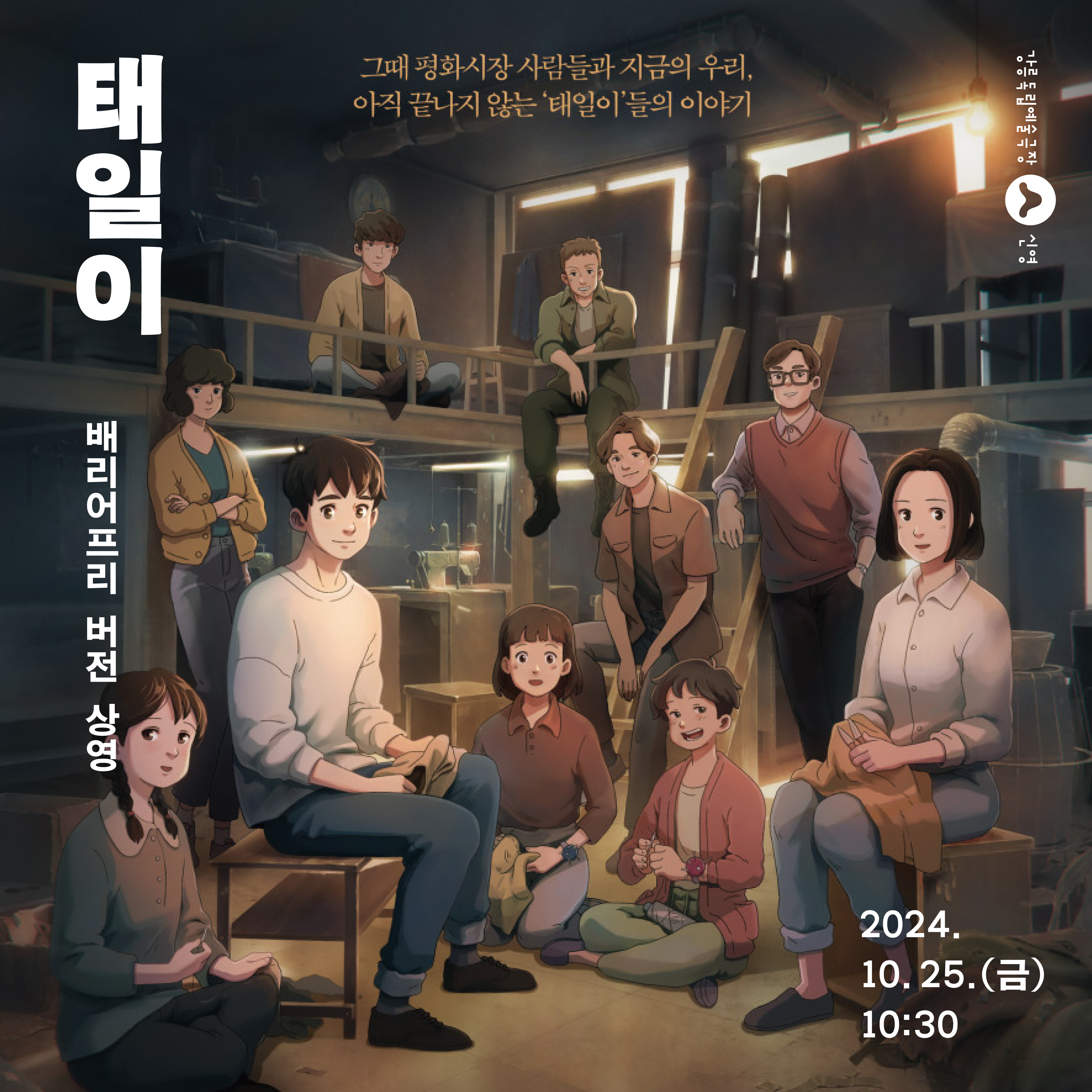 강릉독립예술극장 신영에서는 월 1회 배리어프리 영화를 상영합니다. 10월의 배리어프리 영화는 홍준표 감독의 <태일이>입니다. 1970년 평화시장에서 부당한 노동환경을 바꾸기 위해 뜨겁게 싸웠던 청년 "전태일"의 이야기를 담아낸 장편 애니메이션입니다. 장동윤, 염혜란, 진선규 등 실력파 배우들의 목소리 연기와 홍준표 감독의 섬세한 작화가 어우러진, 서정적이고 감동적인 애니메이션 <태일이>를 신영에서 다시 만나보세요.