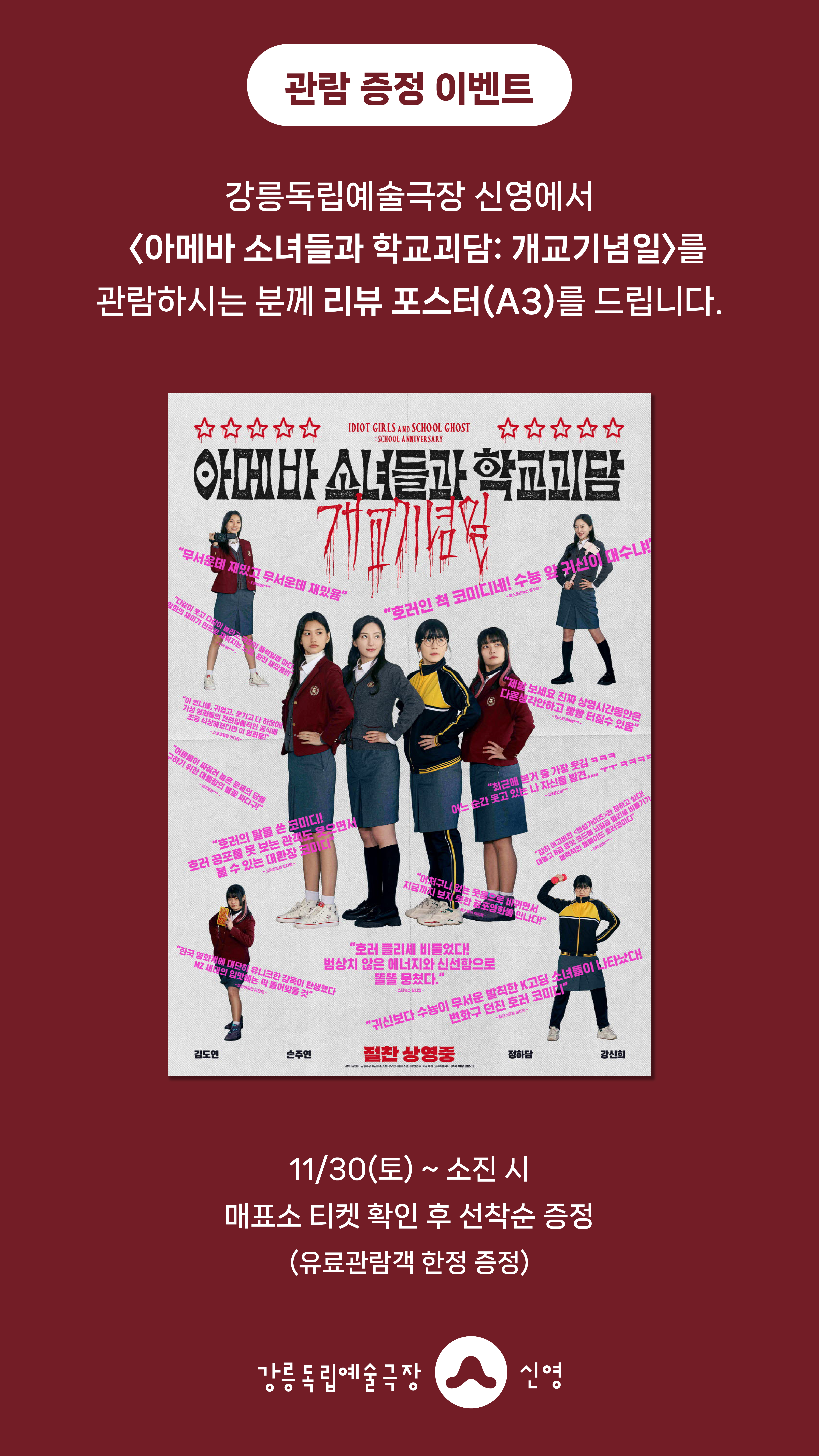 강릉독립예술극장 신영에서 <아메바 소녀들과 학교괴담: 개교기념일>을 관람하시는 분께 선착순으로 리뷰포스터(A3)를 드립니다.