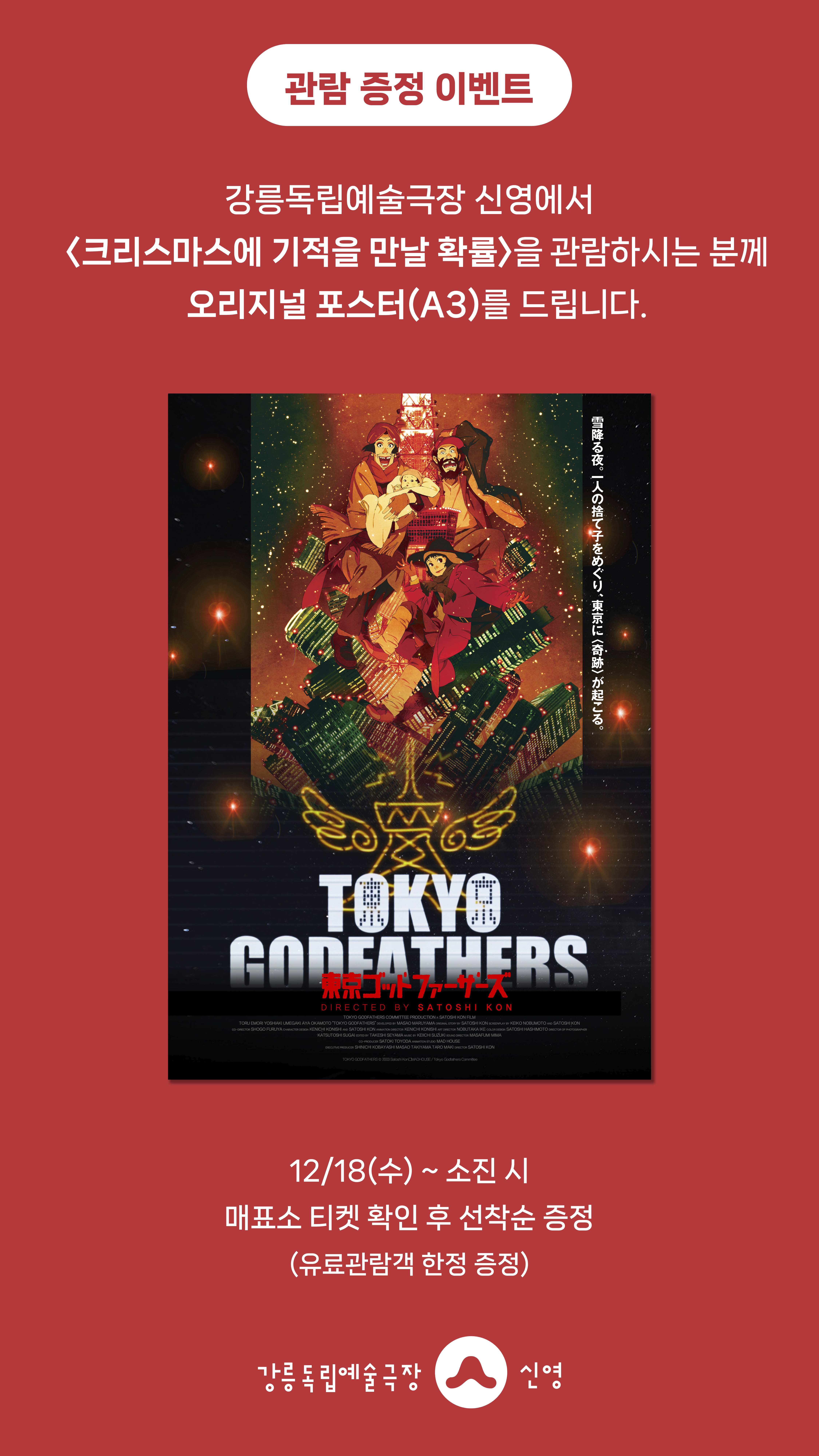 강릉독립예술극장 신영에서 <크리스마스에 기적을 만날 확률>을 관람하시는 분께 선착순으로 오리지널 포스터(A3)를 드립니다.