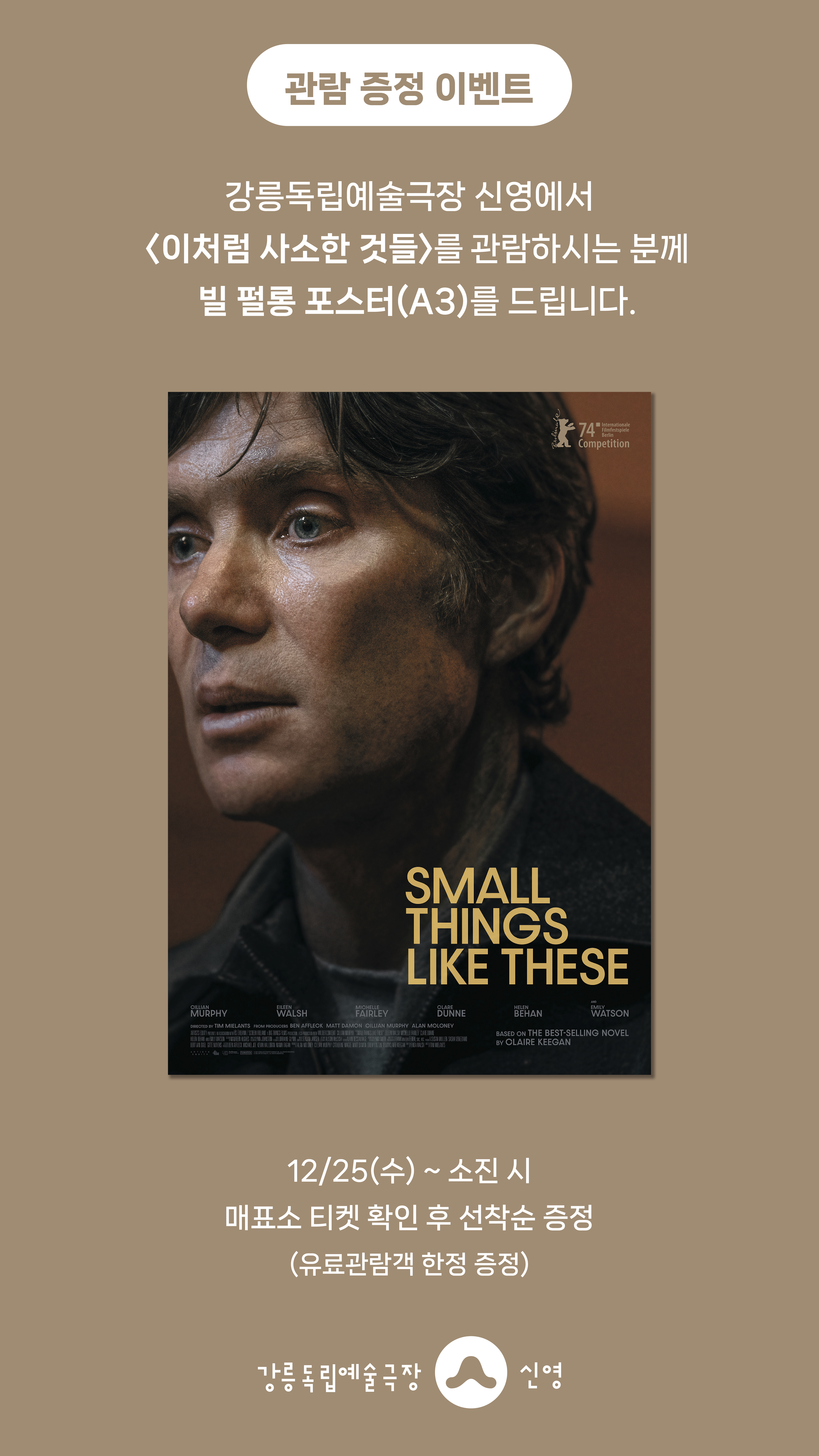 강릉독립예술극장 신영에서 <이처럼 사소한 것들>을 관람하시는 분께 선착순으로 빌 펄롱 포스터 (A3)를 드립니다.