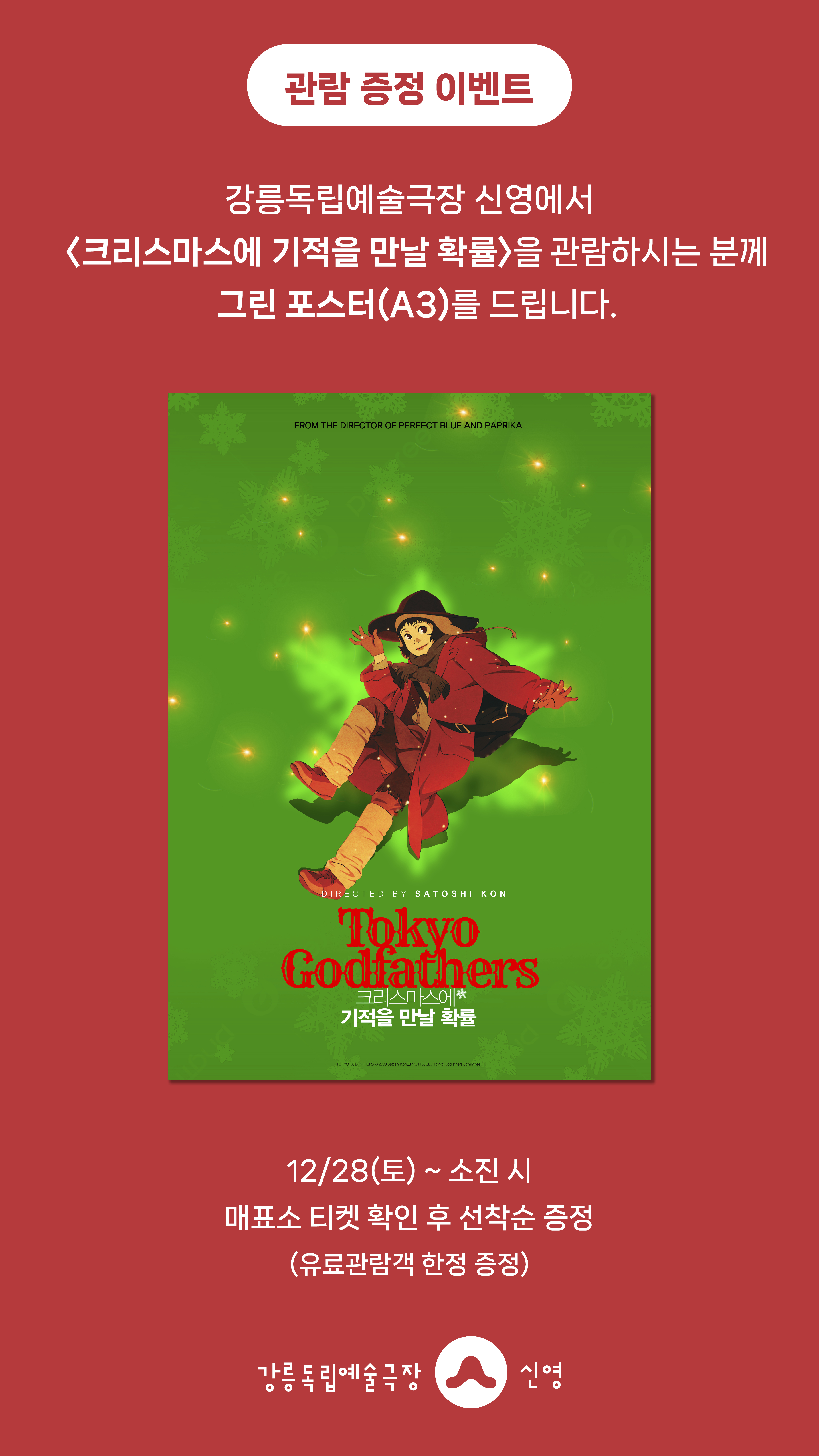 강릉독립예술극장 신영에서 <크리스마스에 기적을 만날 확률>을 관람하시는 분께 선착순으로 그린 포스터(A3) / 일러스트 포스터(A3) 를 드립니다. (택1)