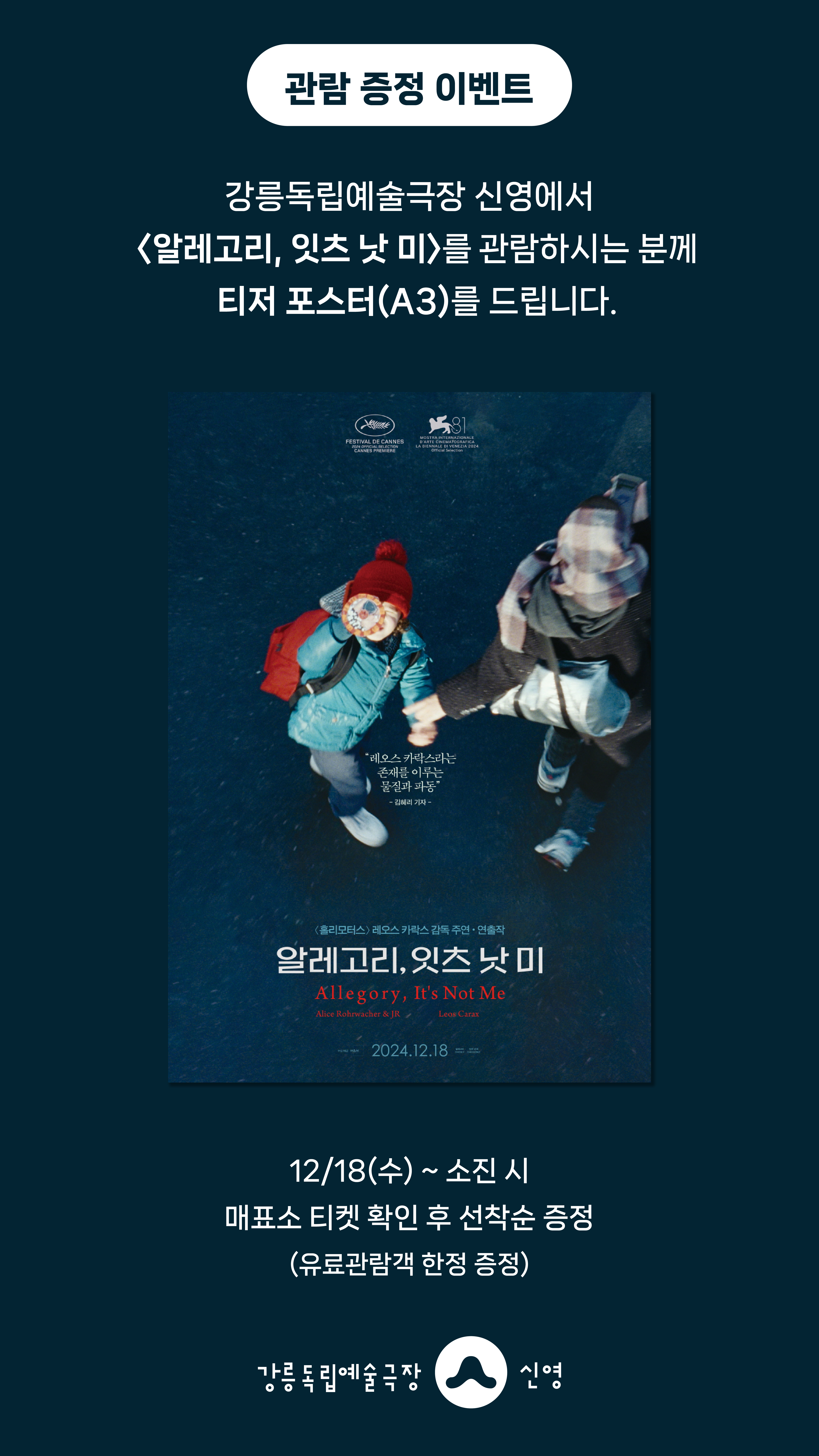 강릉독립예술극장 신영에서 <알레고리, 잇츠 낫 미>를 관람하시는 분께 선착순으로 티저 포스터(A3)를 드립니다.
