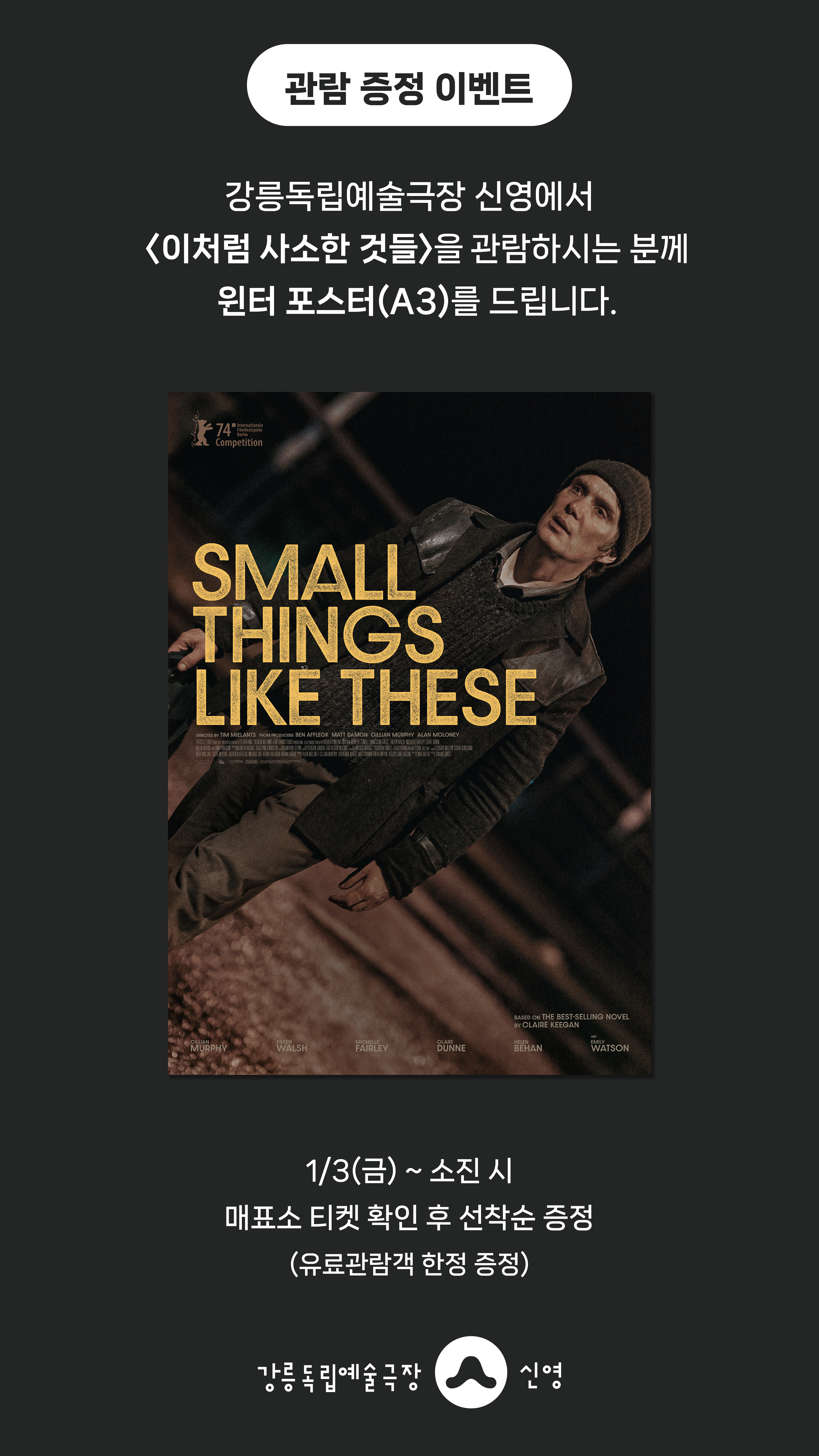 강릉독립예술극장 신영에서 <이처럼 사소한 것들>을 관람하시는 분께 선착순으로 윈터 포스터(A3)를 드립니다.